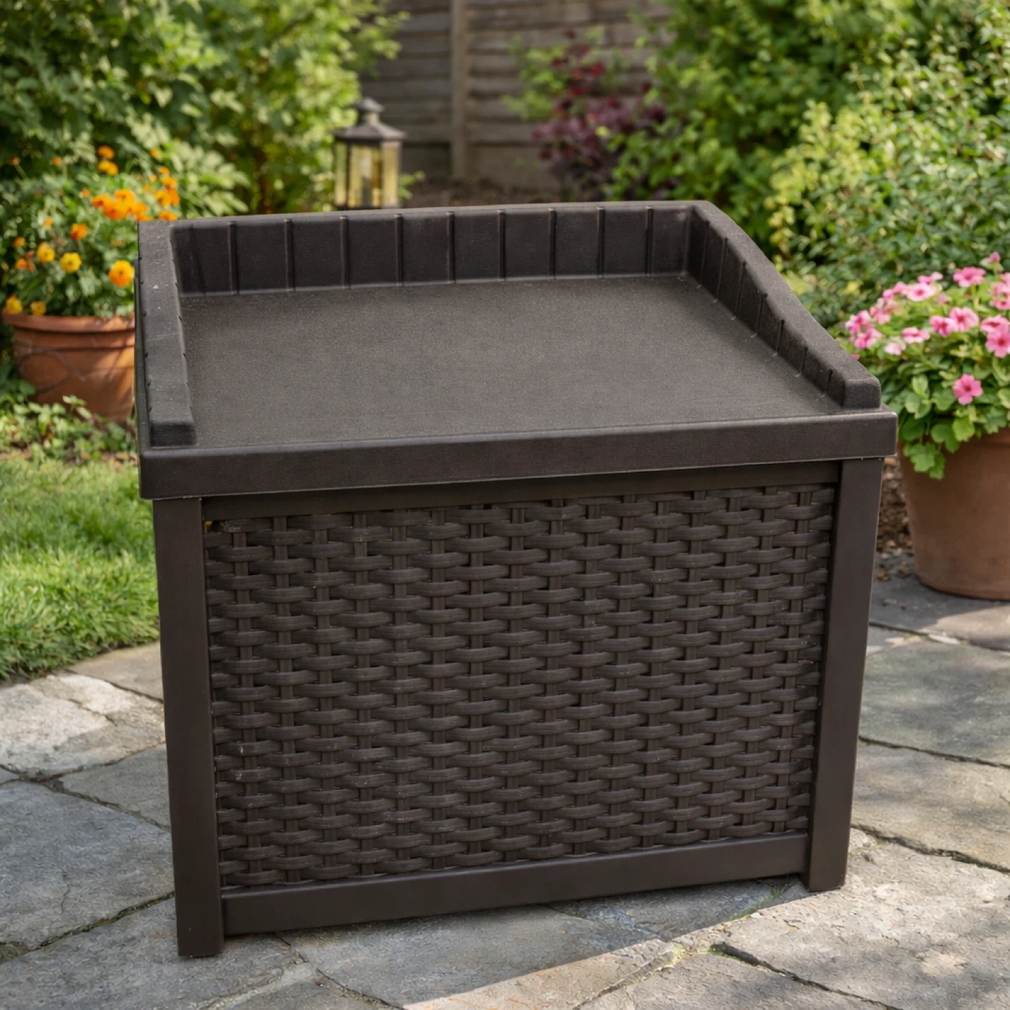 This is a brown wicker outdoor storage bench, perfect for storing garden tools or cushions. It's in great condition and ready to use on your patio or deck