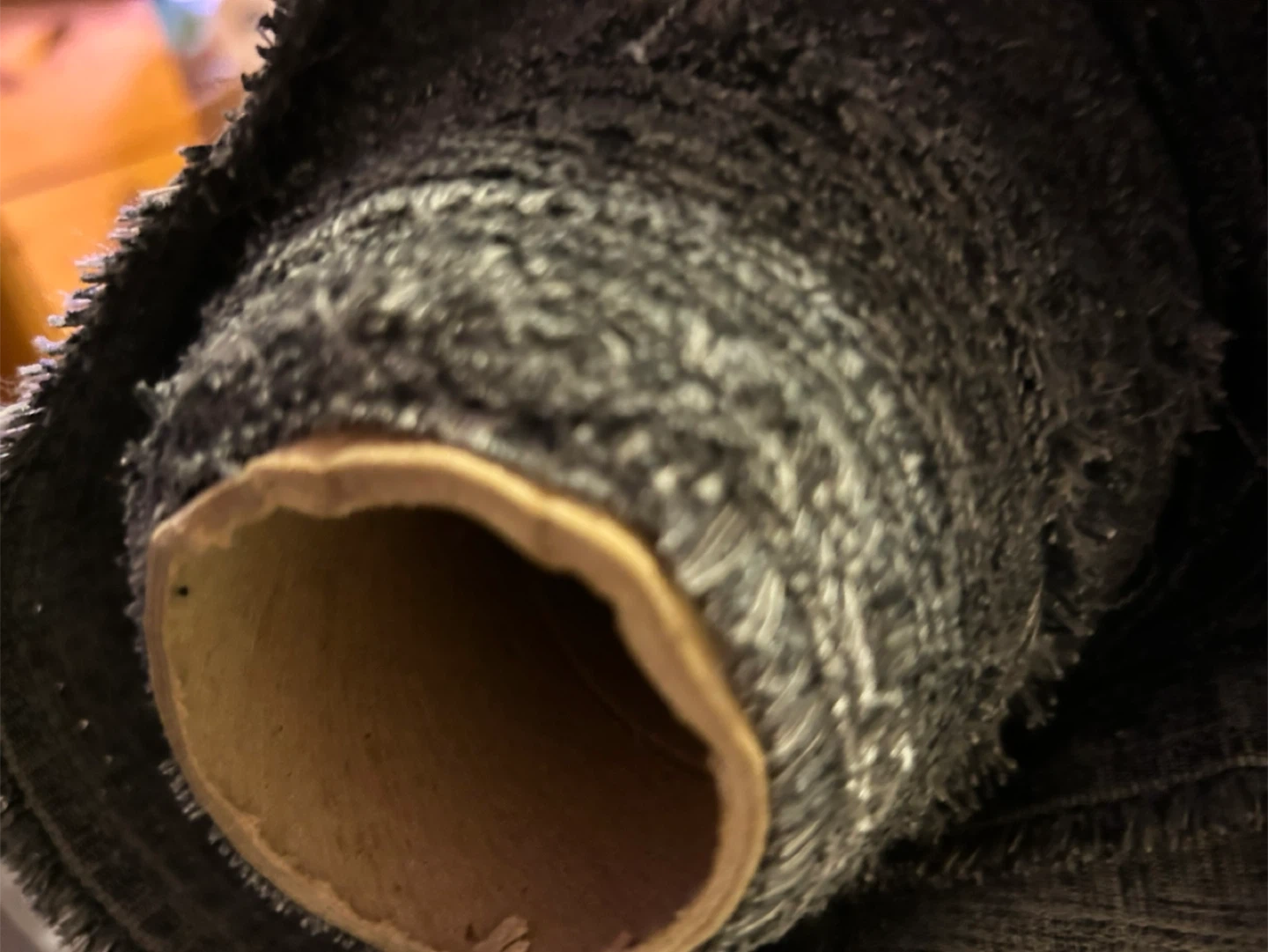 This is a roll of textured fabric. It's a deep grey colour with a subtle sheen. This fabric appears to be suitable for upholstery or crafting projects.