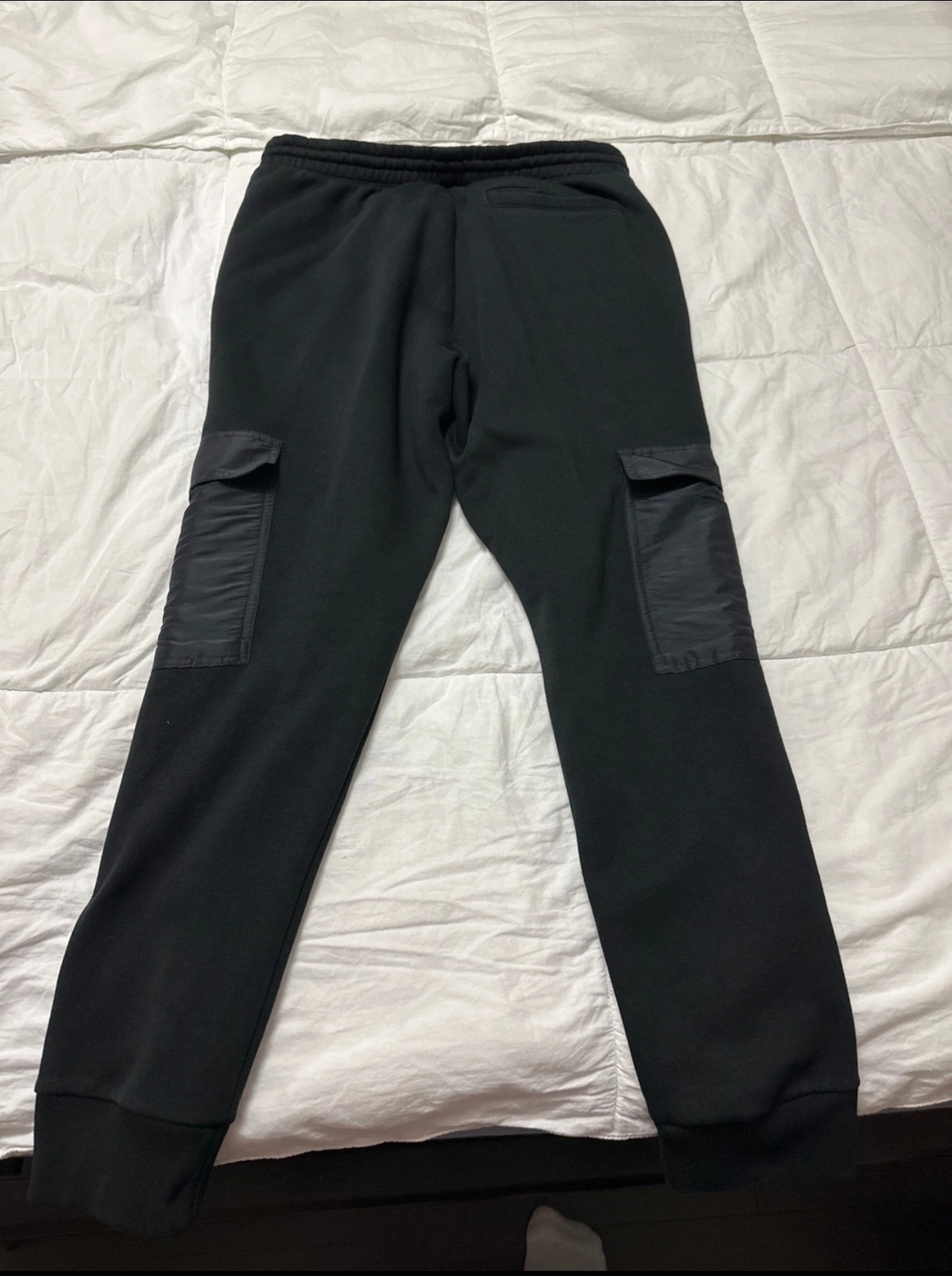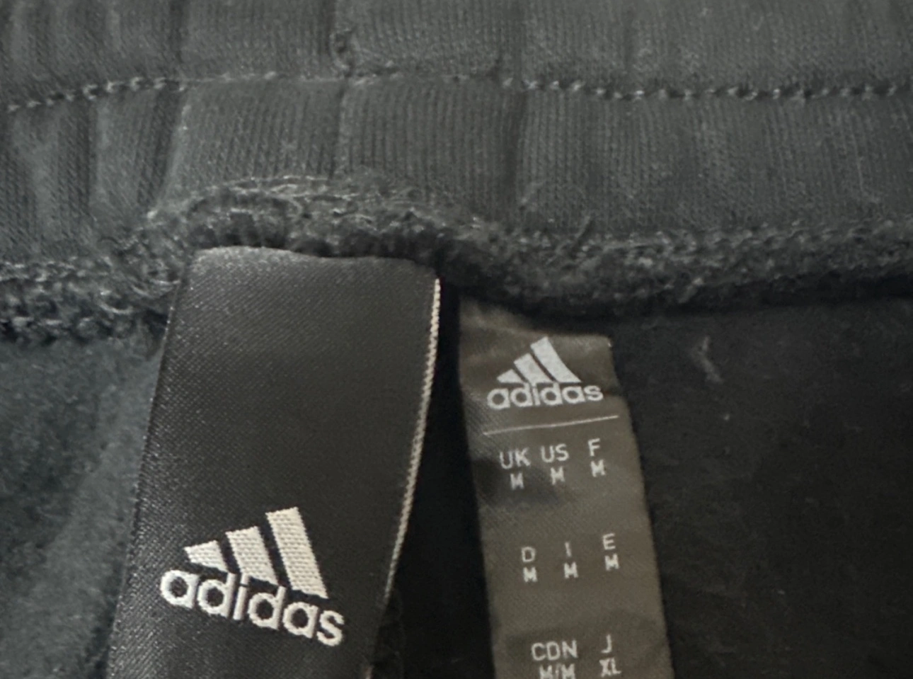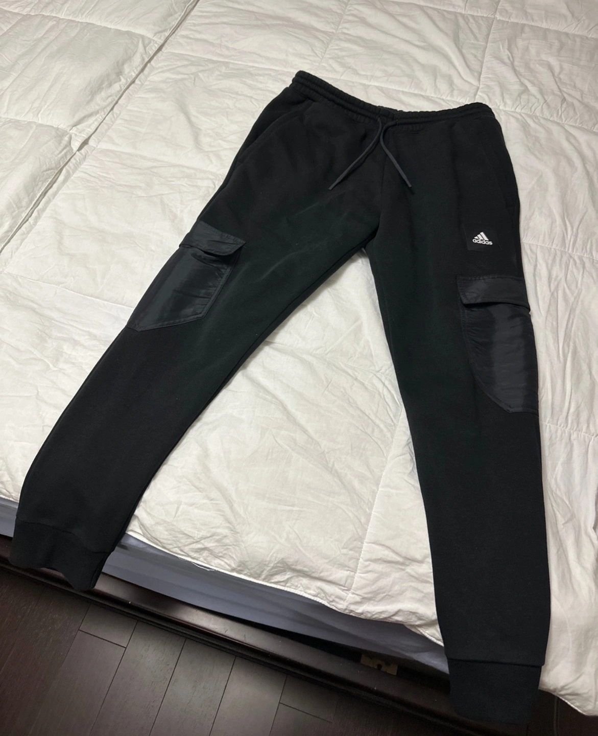 Black Adidas cargo joggers with two large cargo pockets on each leg. The joggers are made of a soft, comfortable fabric. The waist is elastic with a draw string. There is a small Adidas logo on the right thigh. The joggers are in excellent; like new condition. These were a gift but I am 6’3 and the size is too short for me length wise . Asking $40 OBO.
