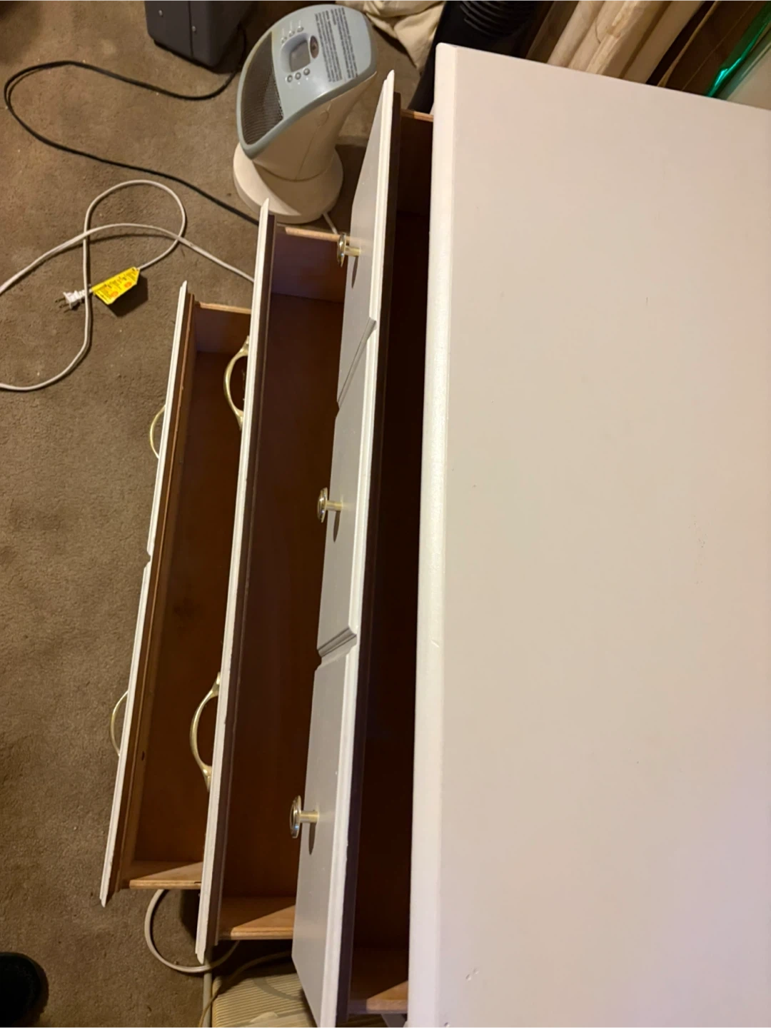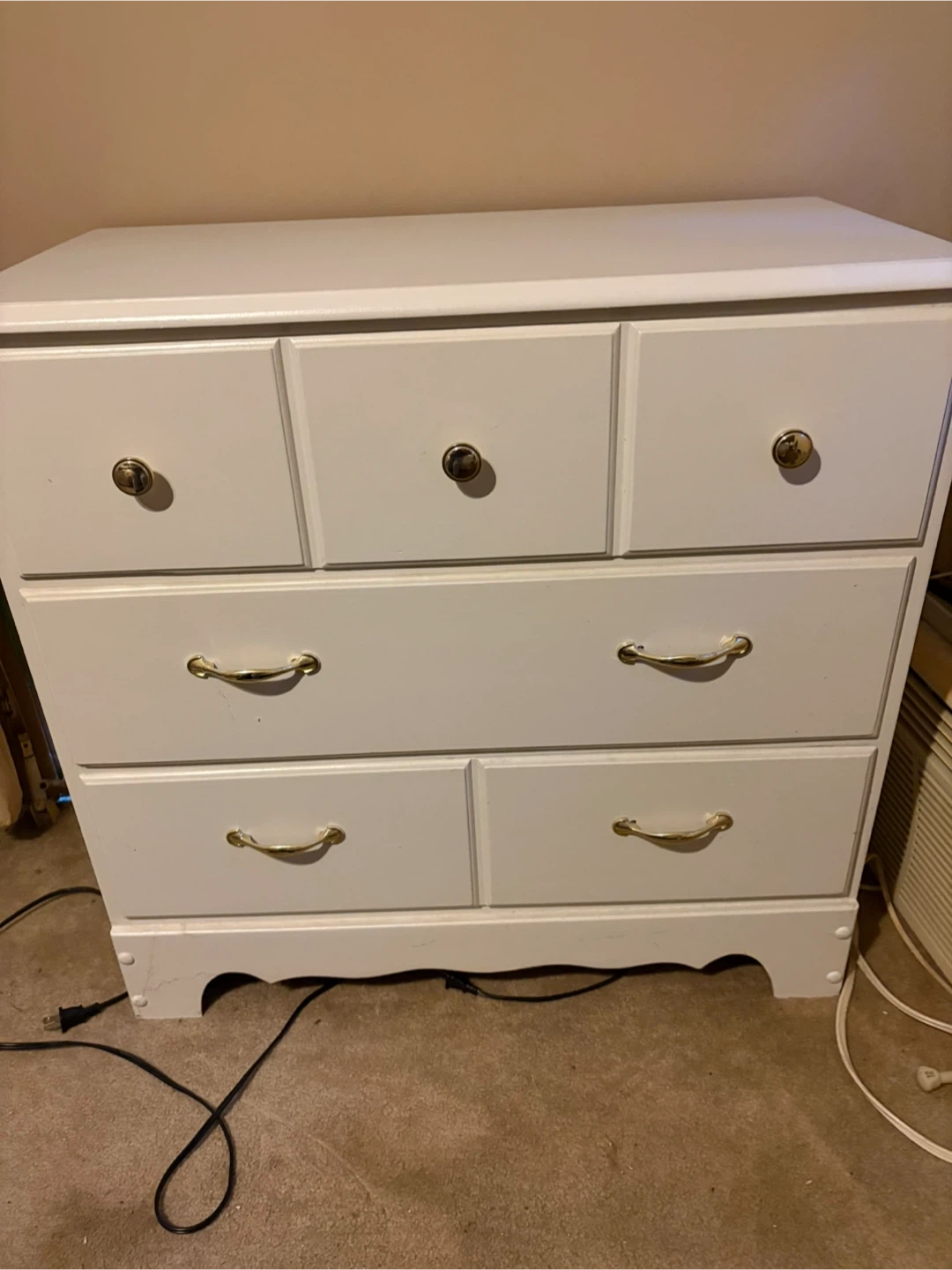 White dresser featuring 3 drawers for storage. It has a classic design with gold-toned drawer pulls. This chest of drawers offers ample space for clothes and linens.Reasonable offers considered.Please if you are truly interested msg me as I am very busy emptying a house out and don’t have time for no shows. This needs to pickup by the 21st .Thanks for understanding.