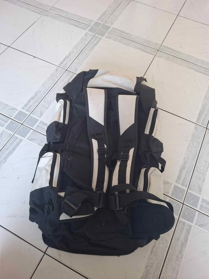 Large backpack for camping in the wilderness or hicking for days. Lots of straps and pouches. Some wear and the zipper is missing from the top pouch as shown in the last 2 photos but otherwise in good condition.