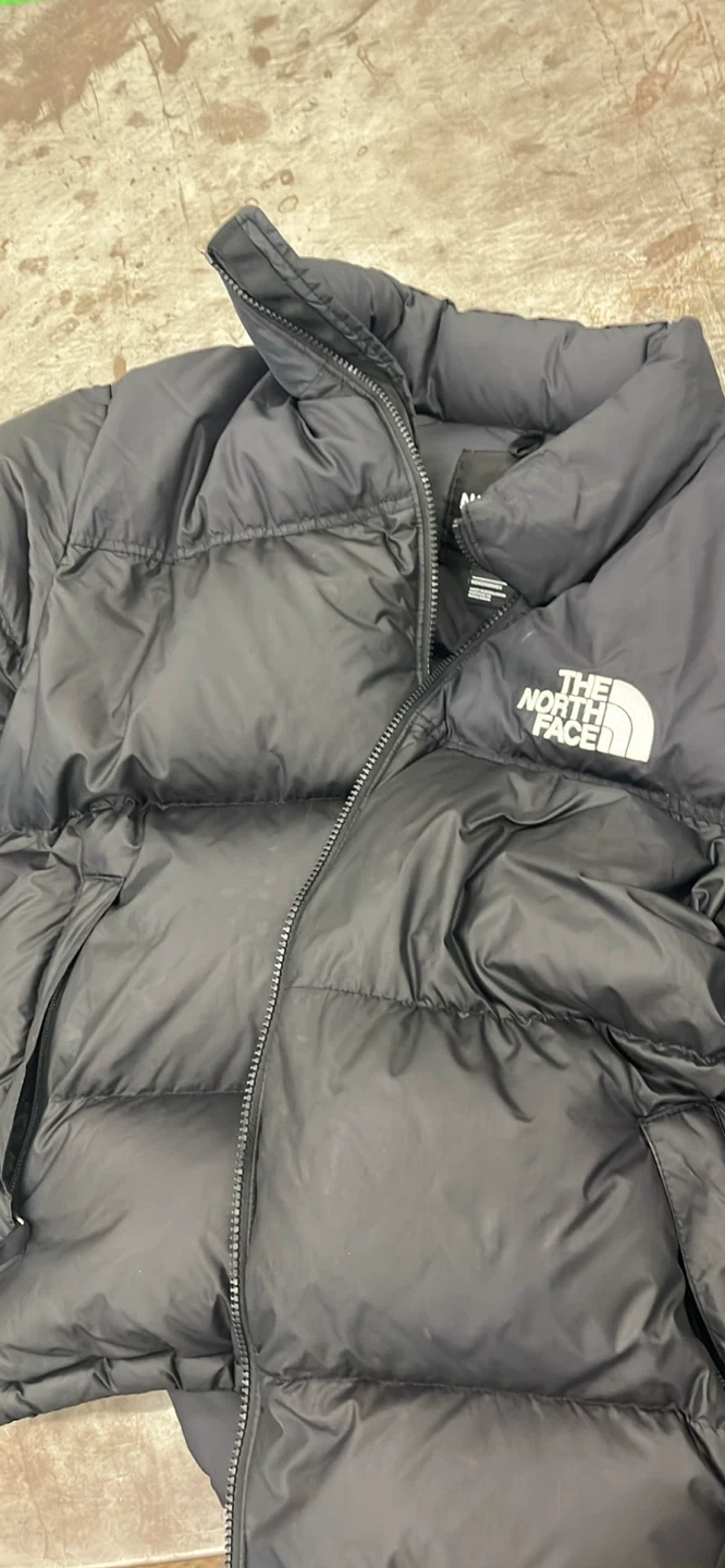 A warm puffer jacket from The North Face in black. It's a great option for staying cozy on colder days. Size is marked as medium.
