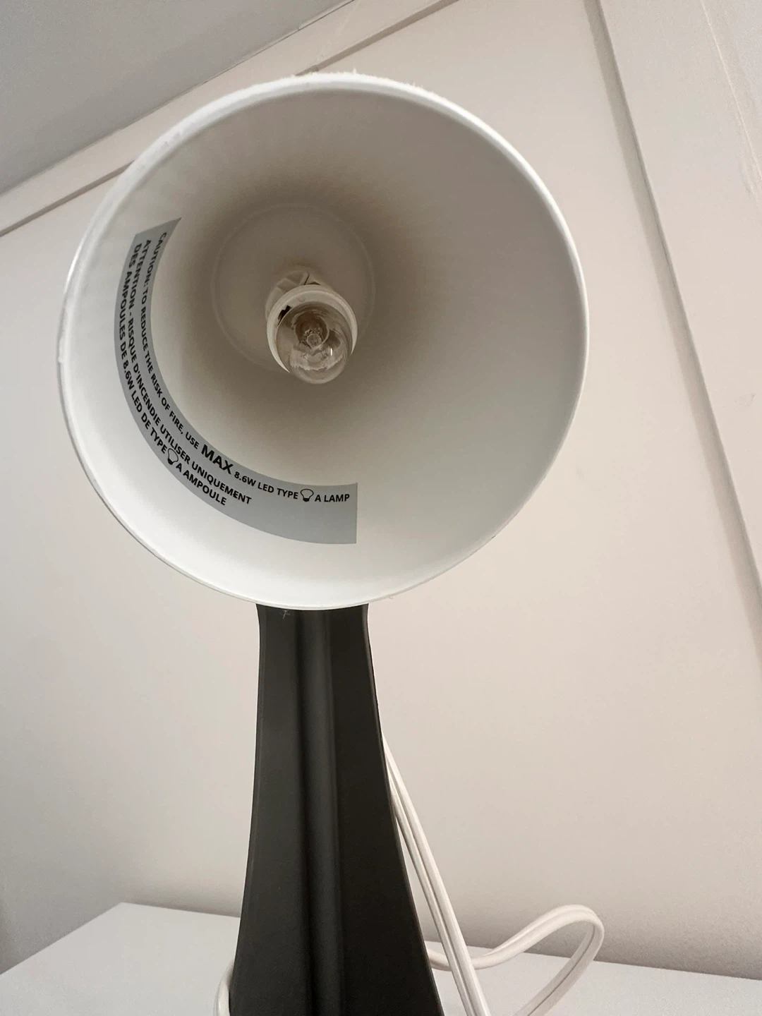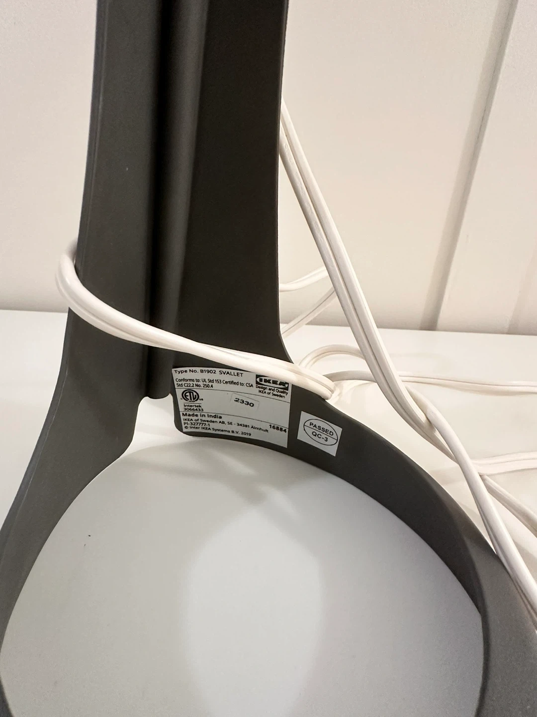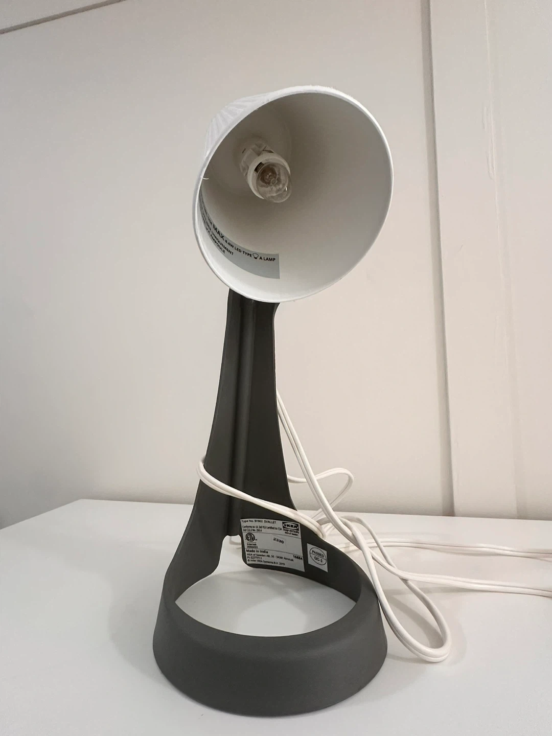 This is an IKEA SYVALLET table lamp. It has a dark grey base and a white, ribbed shade. The lamp is designed to use a max 8.6W LED type A lamp.