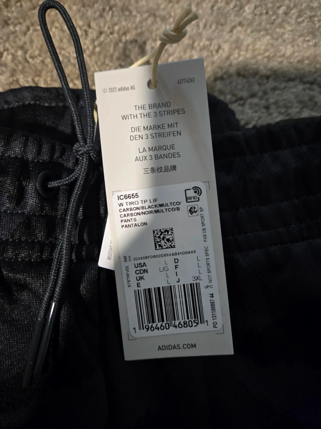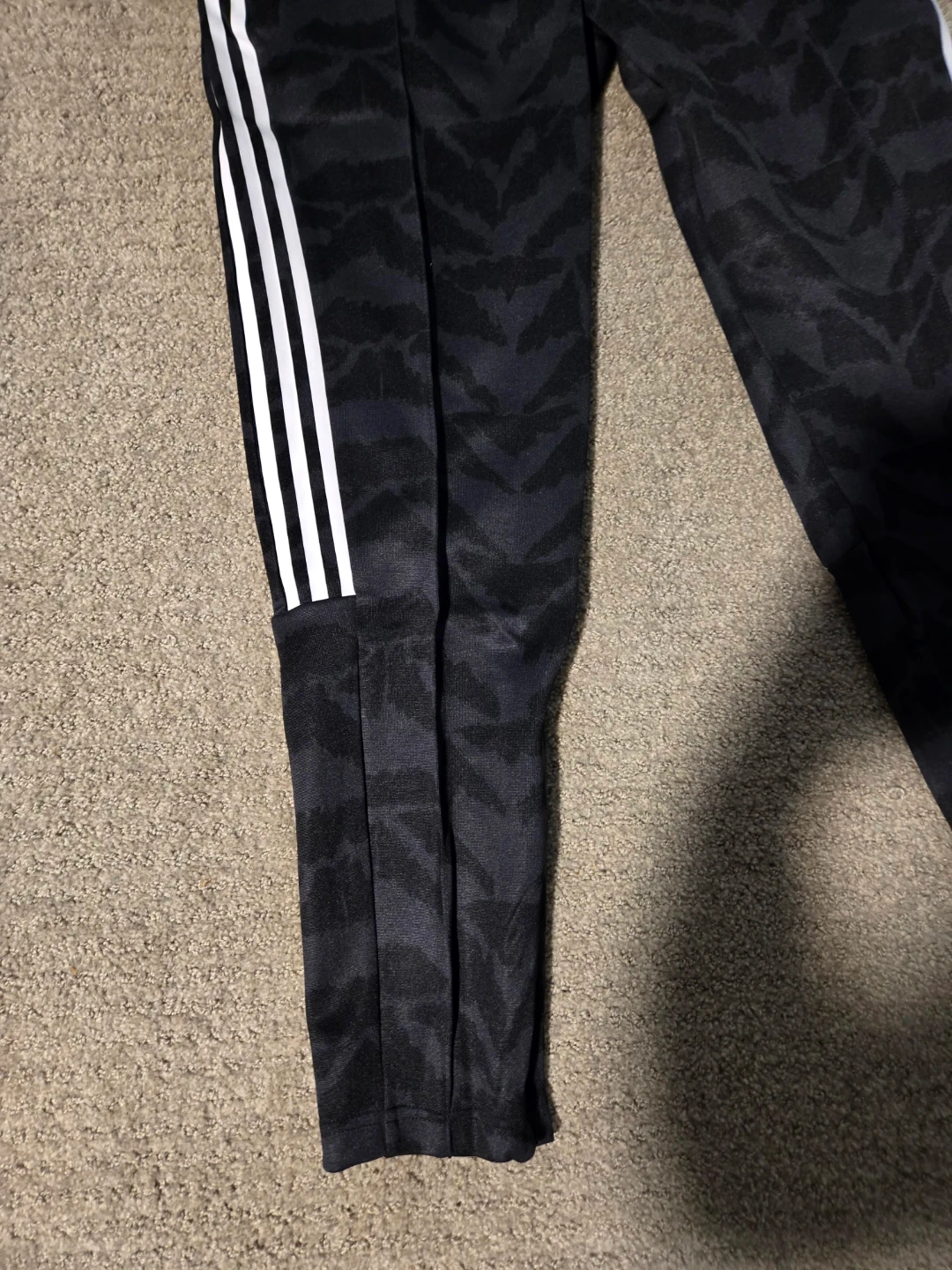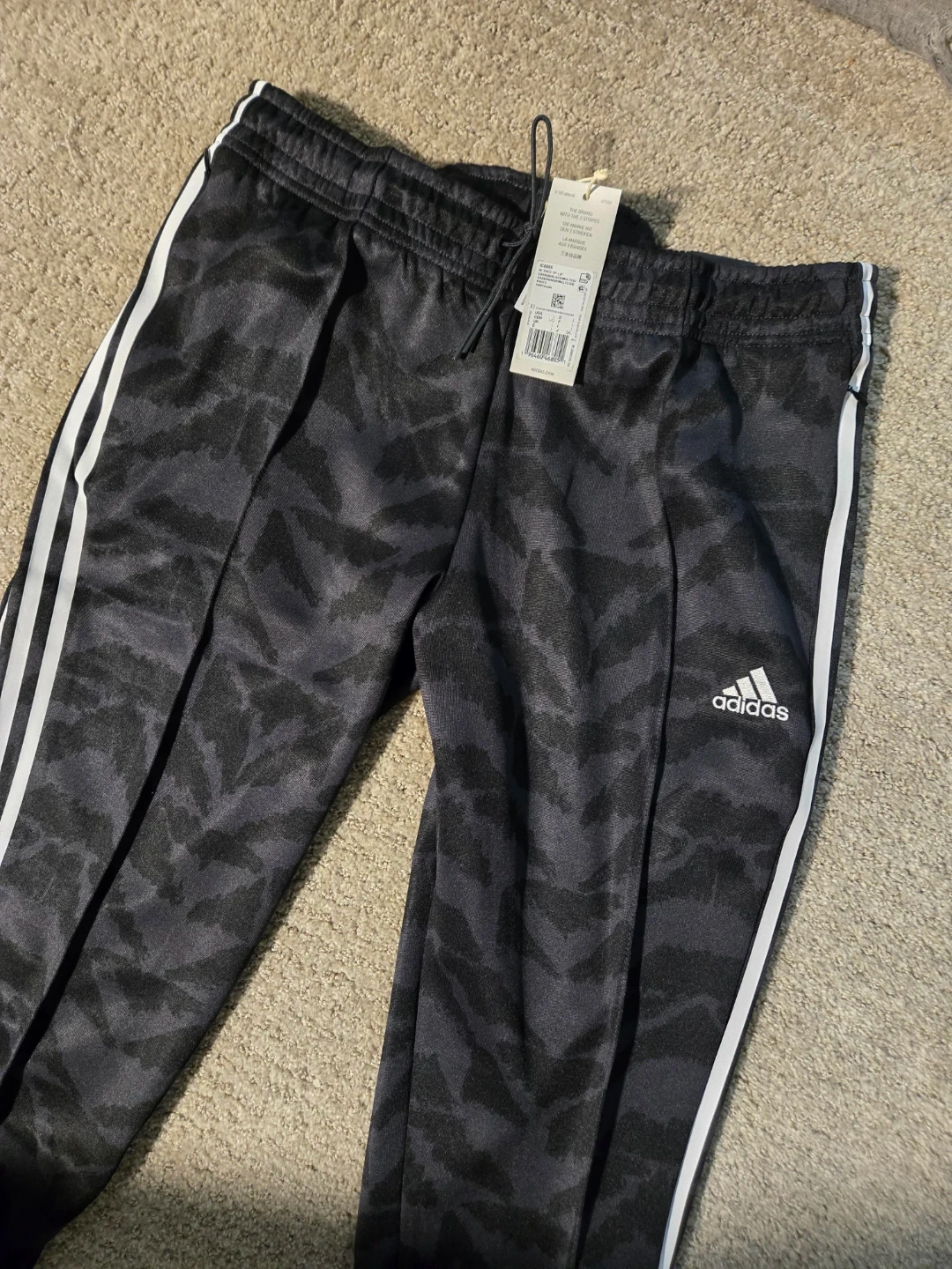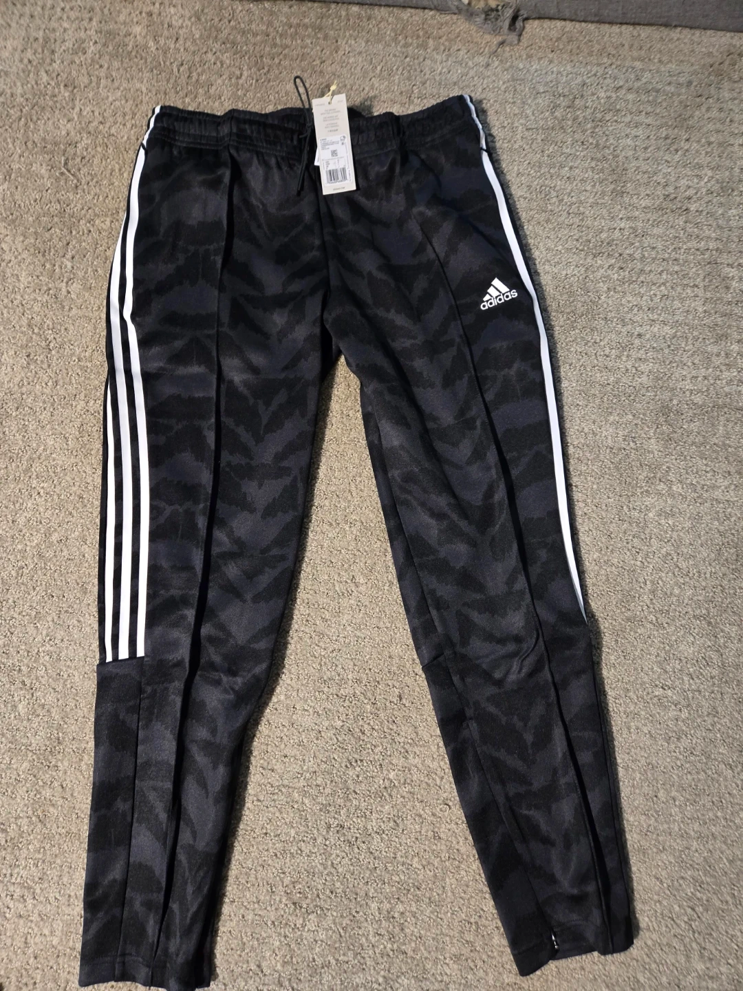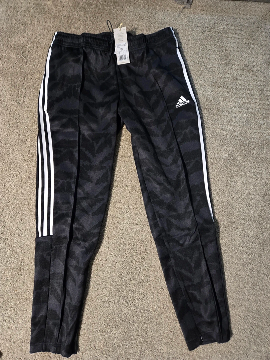 These are Adidas Tiro TP Lf pants. They're black with a grey camo pattern and white stripes. They're a size L.