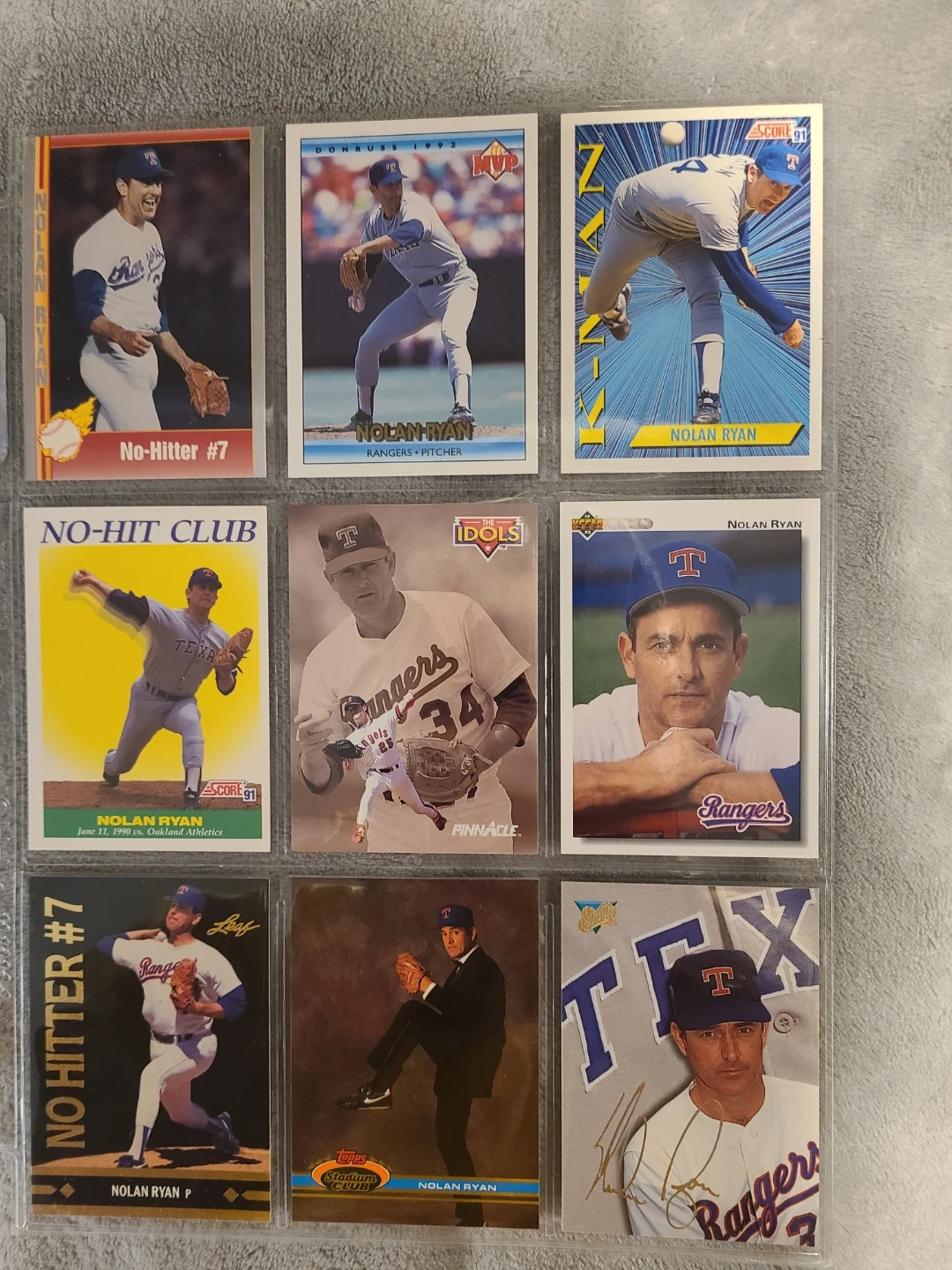 A collection of Nolan Ryan baseball cards. Includes various cards from different sets and years featuring the legendary pitcher. Some cards highlight his no-hitter achievements.
