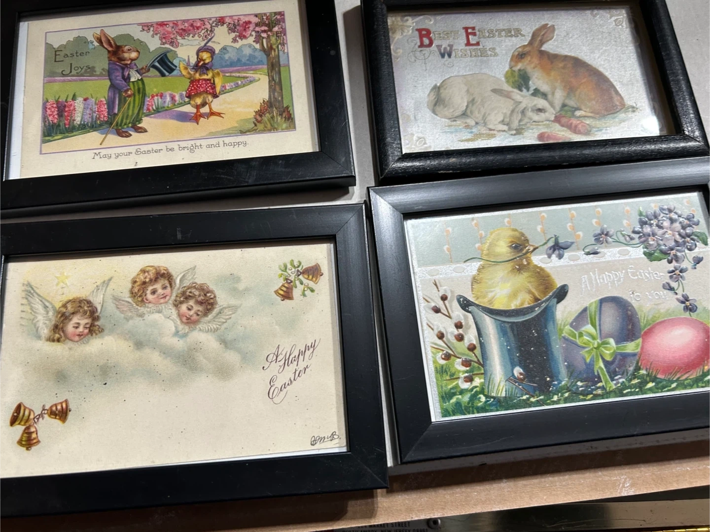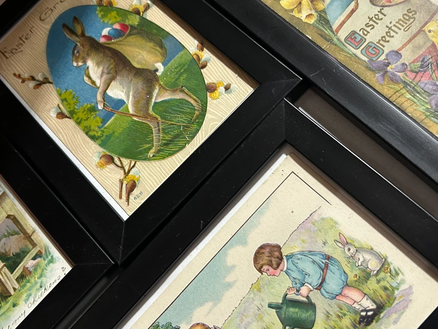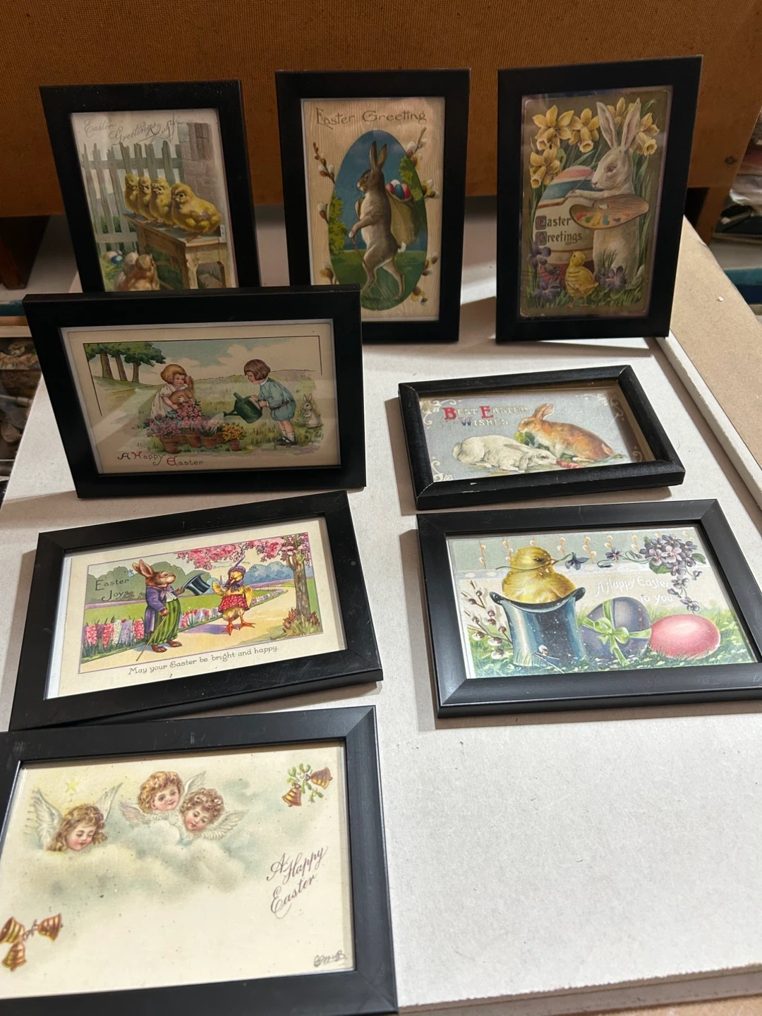 This set includes seven vintage Easter postcards, each beautifully framed in black. They depict charming scenes with bunnies, chicks, and floral elements, perfect for adding a touch of nostalgic holiday cheer. Display these unique pieces to celebrate the season!