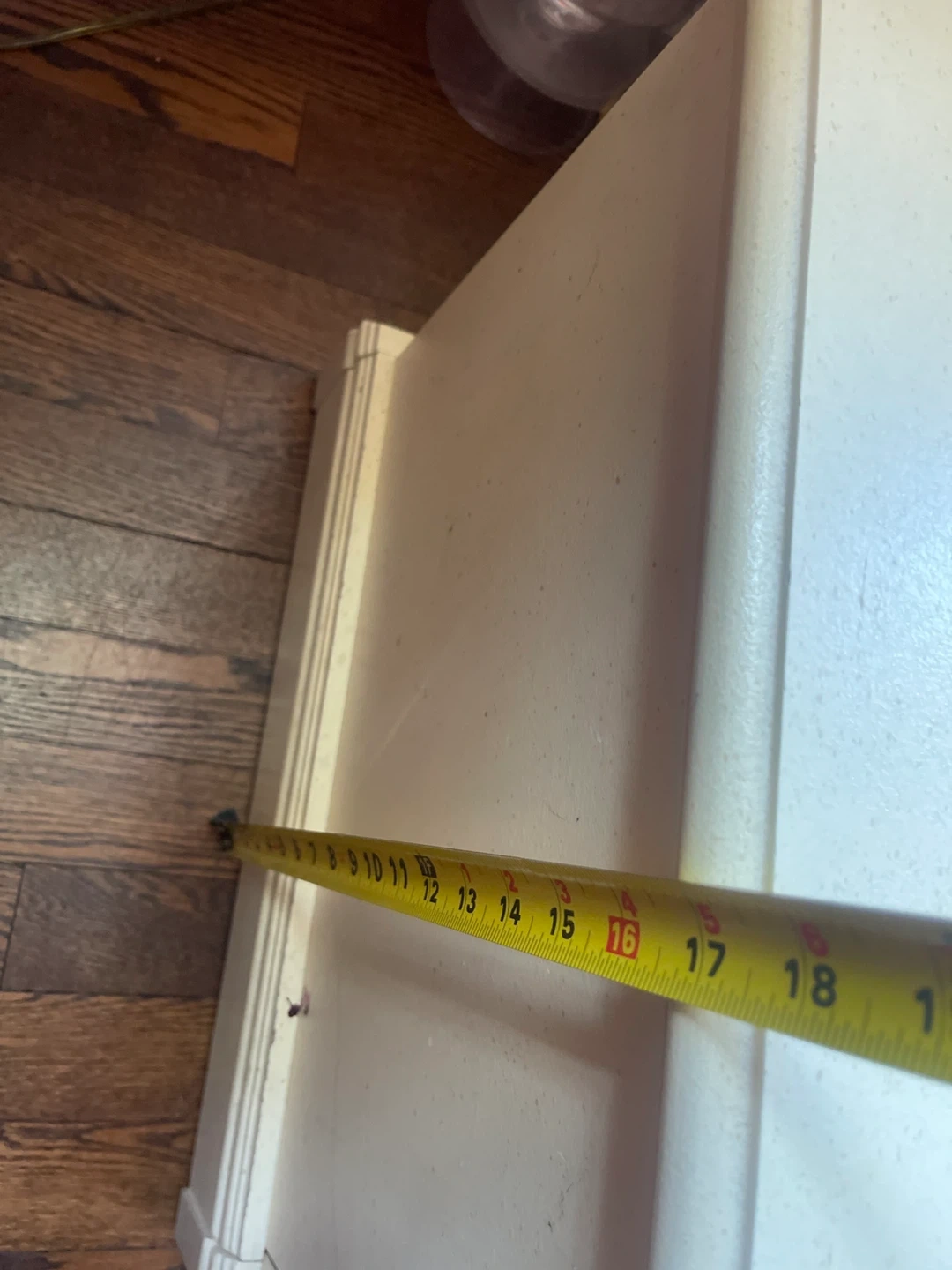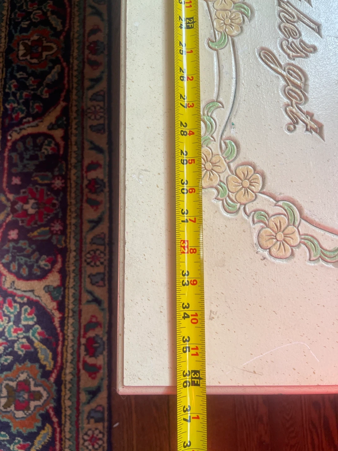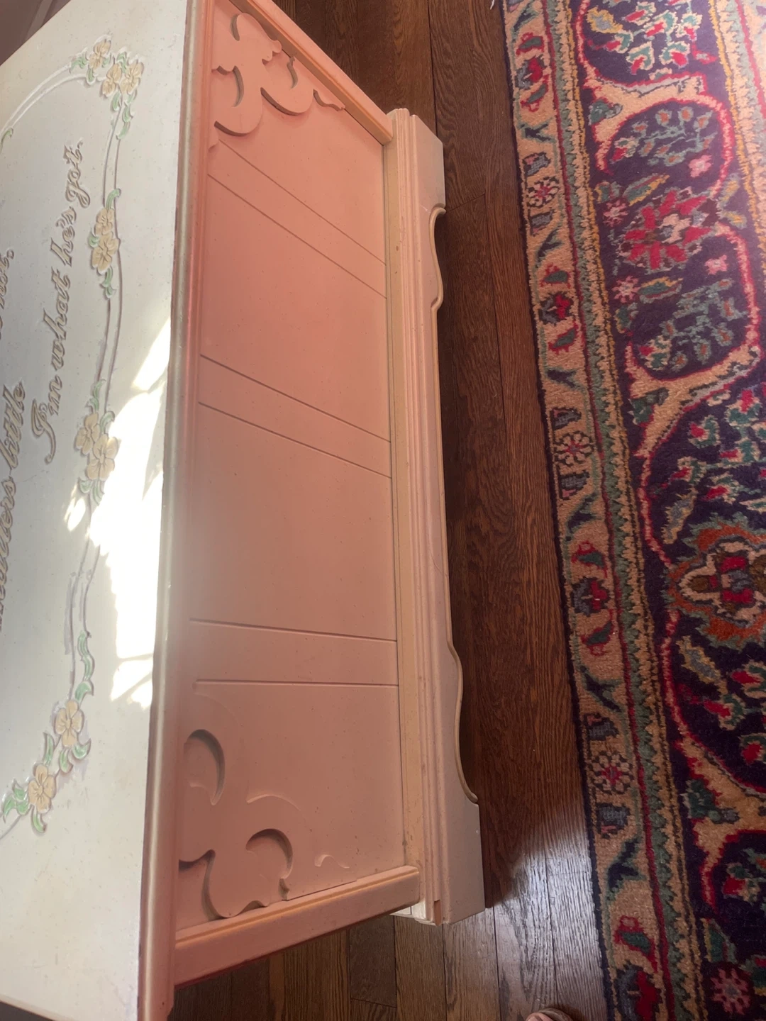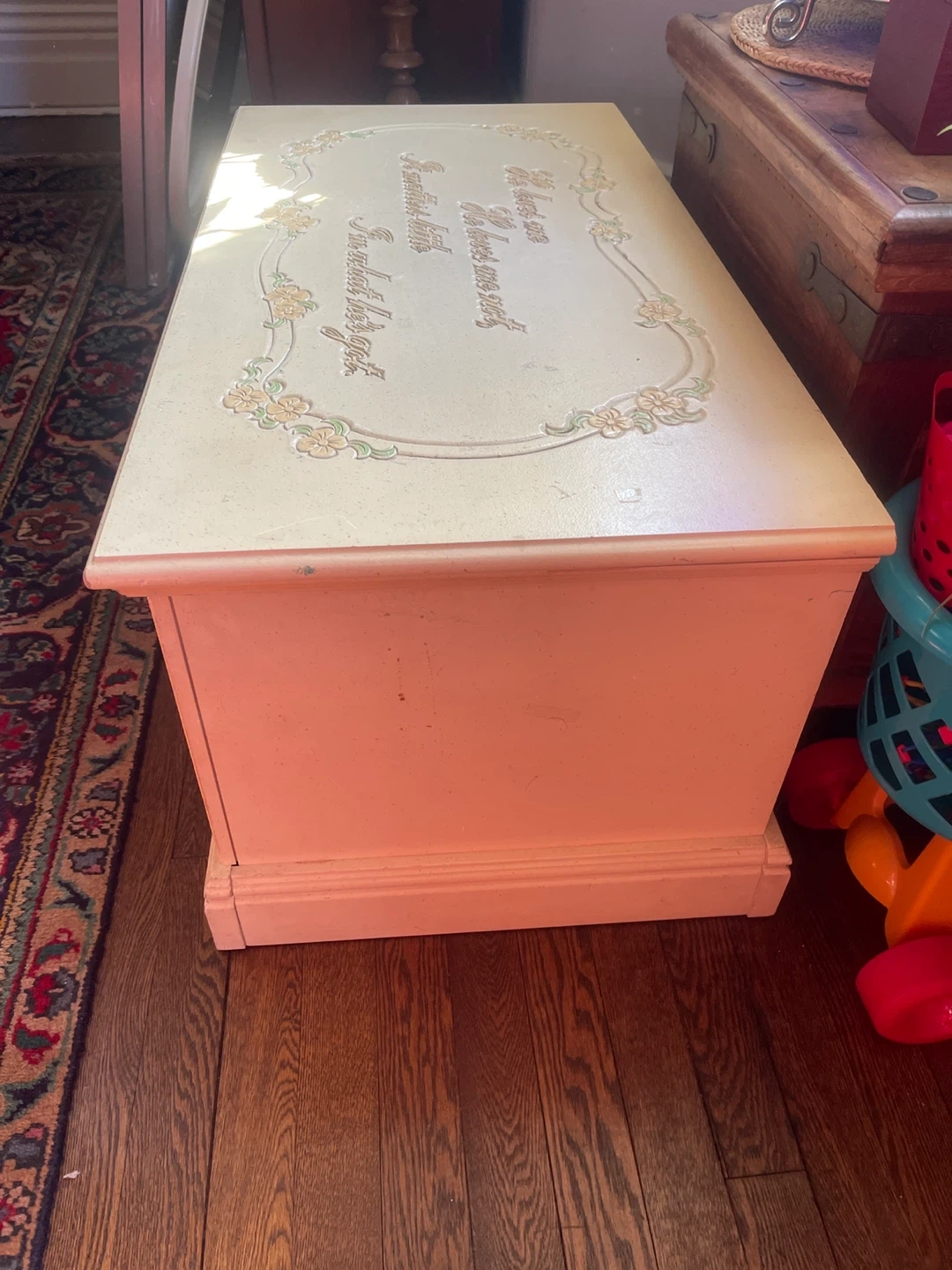 This charming storage chest is painted a soft cream with delicate floral accents and a sweet quote inscribed on the lid. It's perfect for stowing away blankets, toys, or other keepsakes. Very hewvy lid