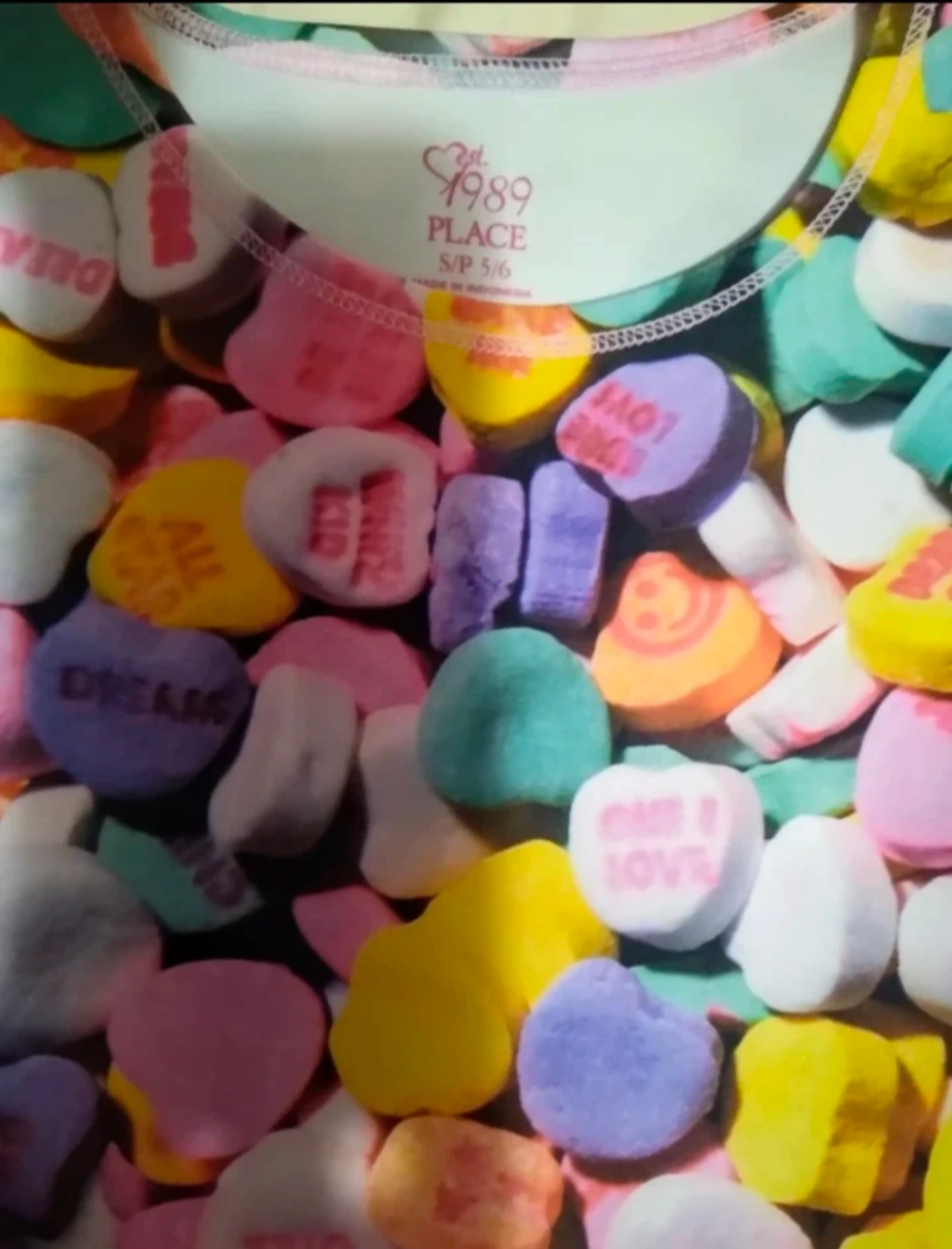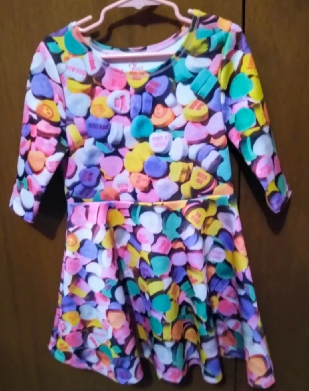 Girl's colourful long-sleeved dress with colourful candy hearts pattern is brand new and so cute! It's from the Children's Place and size 5/6.