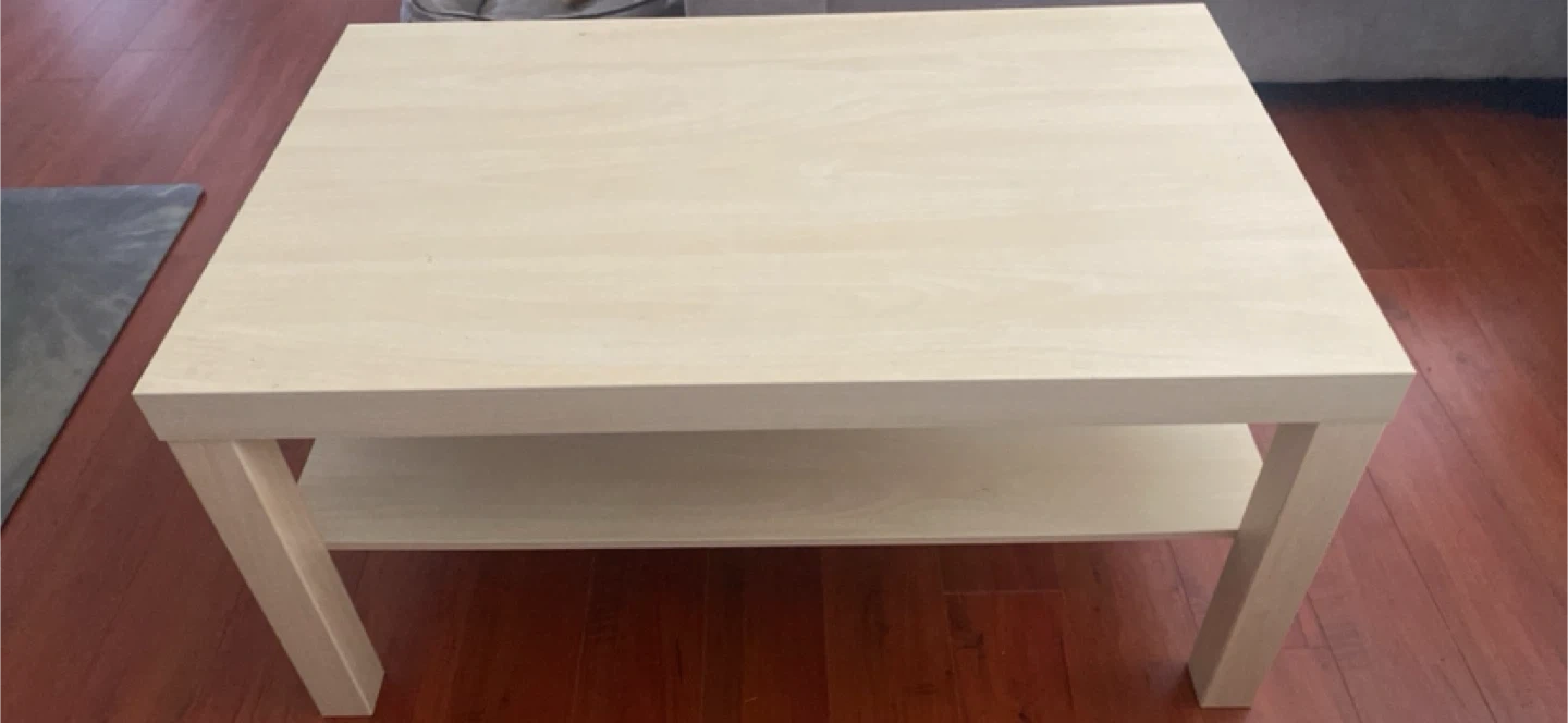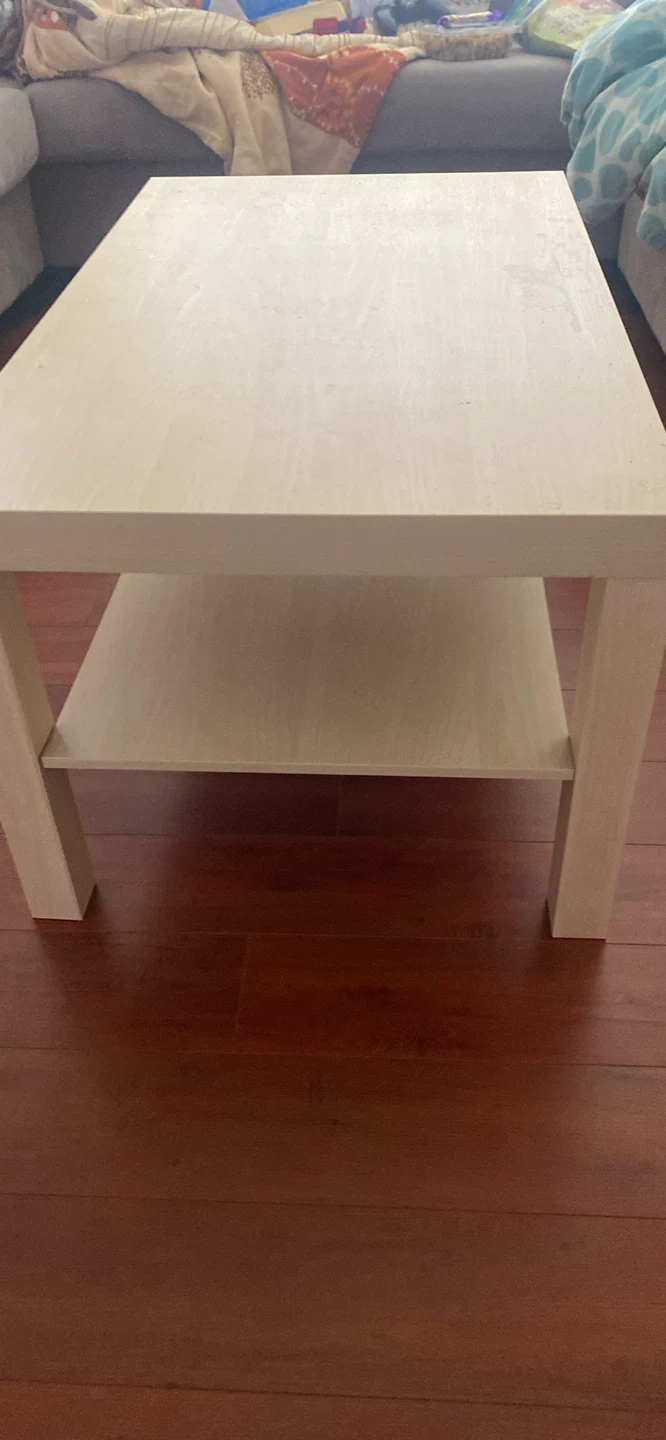 This is an IKEA LACK coffee table. It's white with a wood-like finish and has a lower shelf for storage. Perfect for your living room!