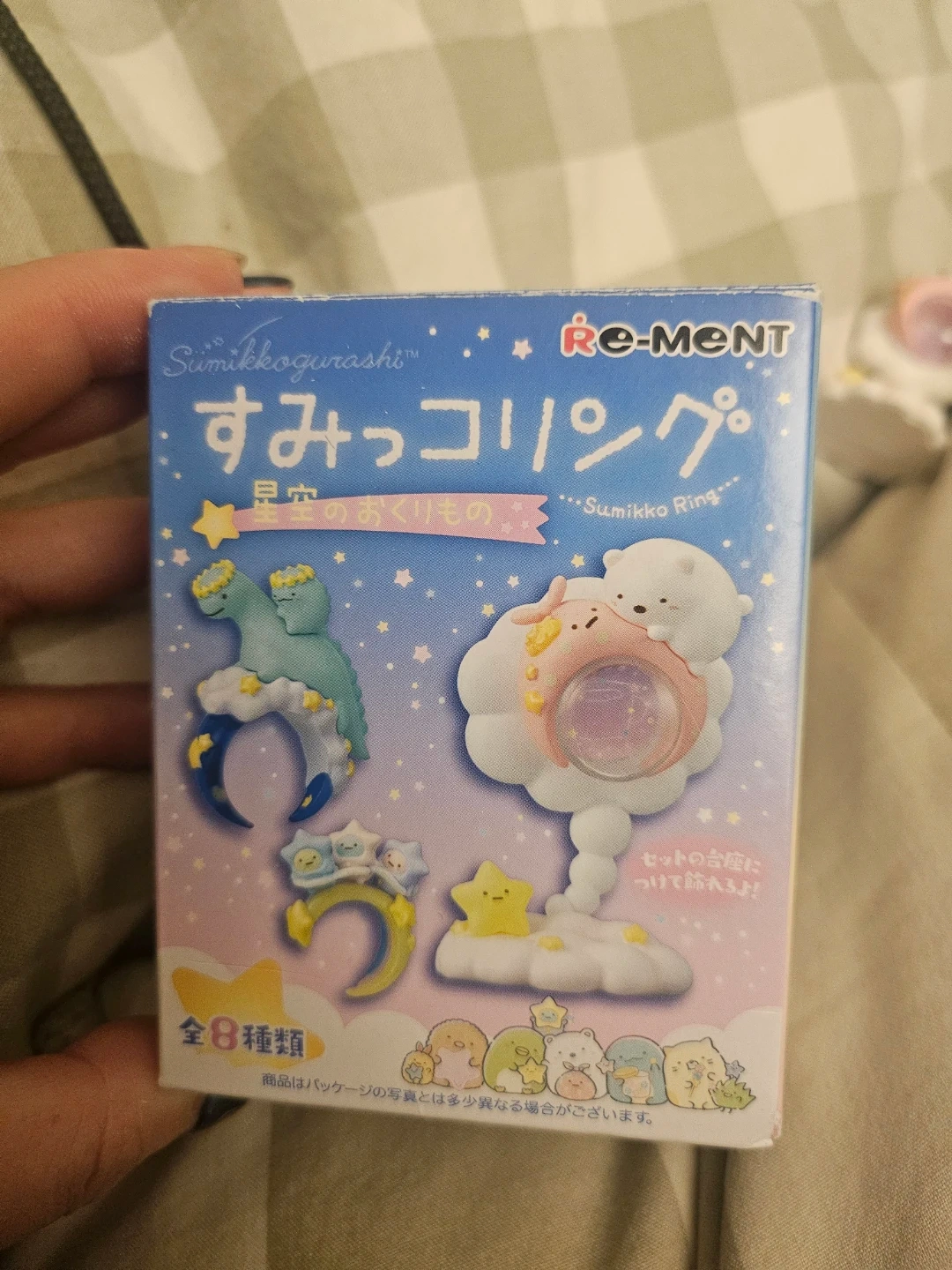 This is a Re-Ment Sumikko Gurashi Ring Collection blind box. It features cute characters from the popular Sumikko Gurashi series. These collectible rings are perfect for adding a touch of fun to your day!