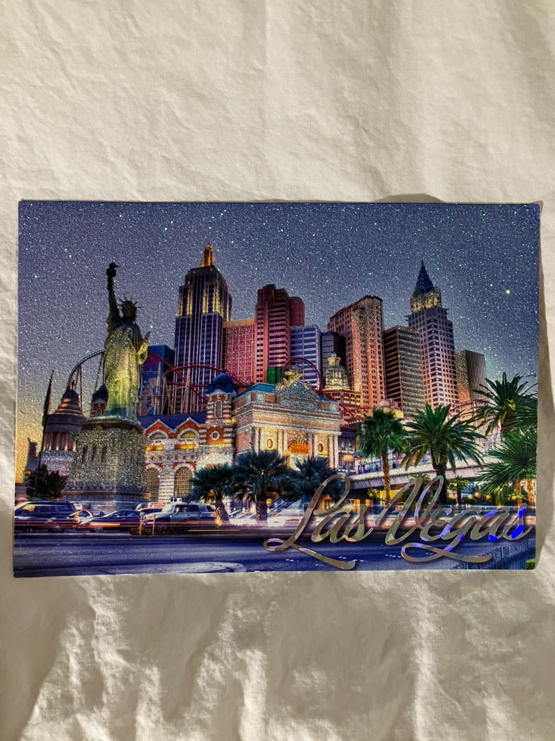 This sparkly art piece features the iconic Las Vegas skyline under a starry night sky. It's a vibrant display showcasing famous landmarks and palm trees. A great souvenir for anyone who loves Vegas!