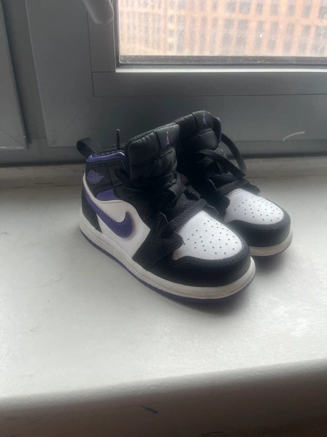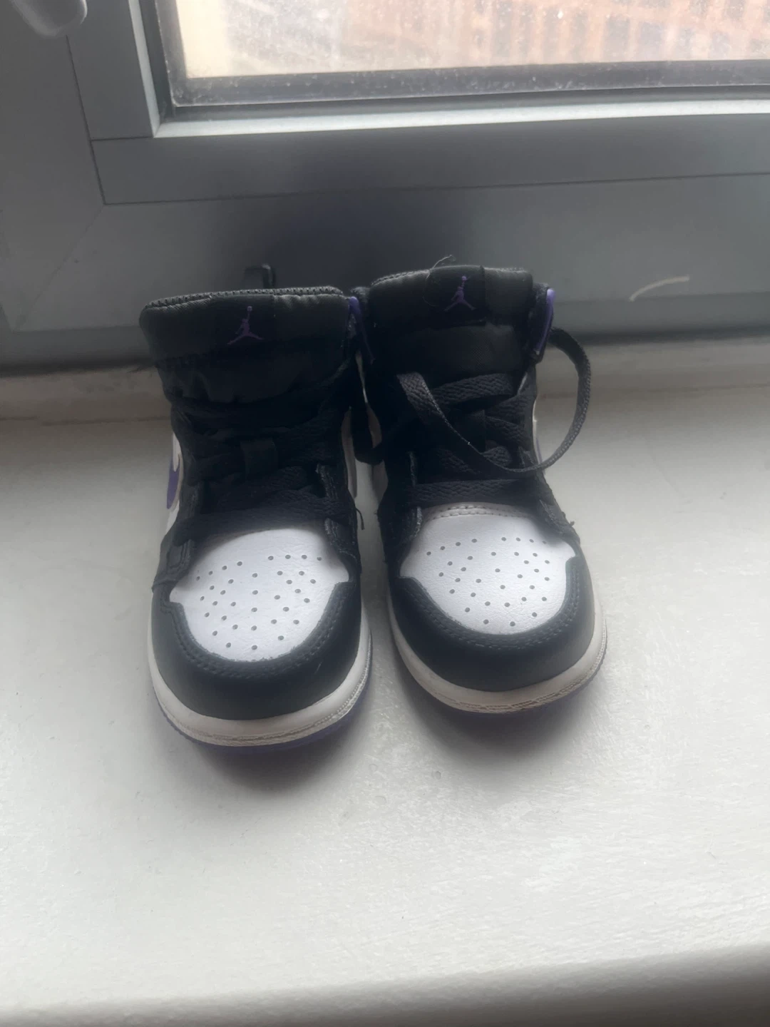 These are toddler high-top Jordan 1 sneakers in black, white, and purple. They feature laces for closure. Great for little ones starting their sneaker collection! NO BOX