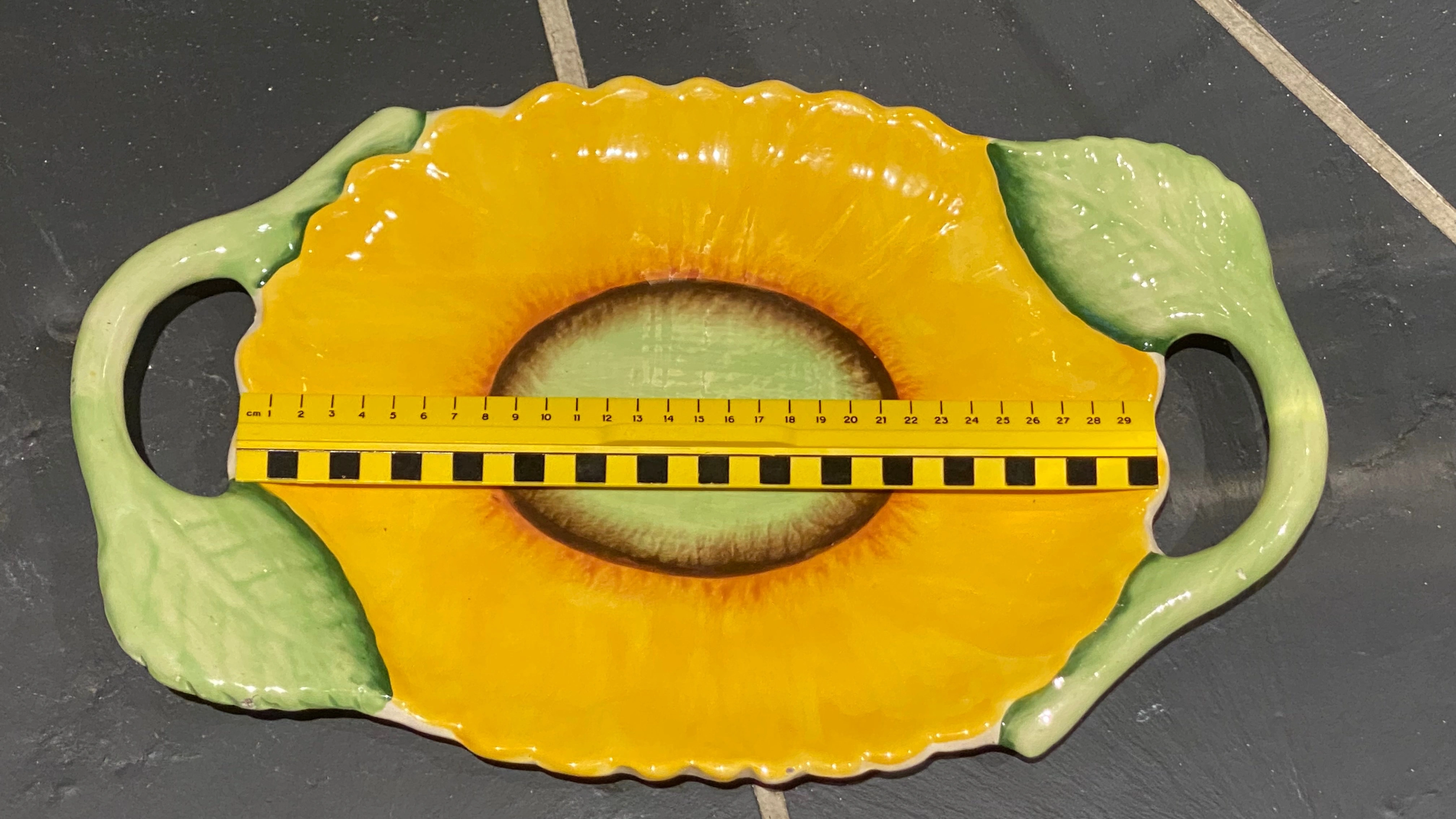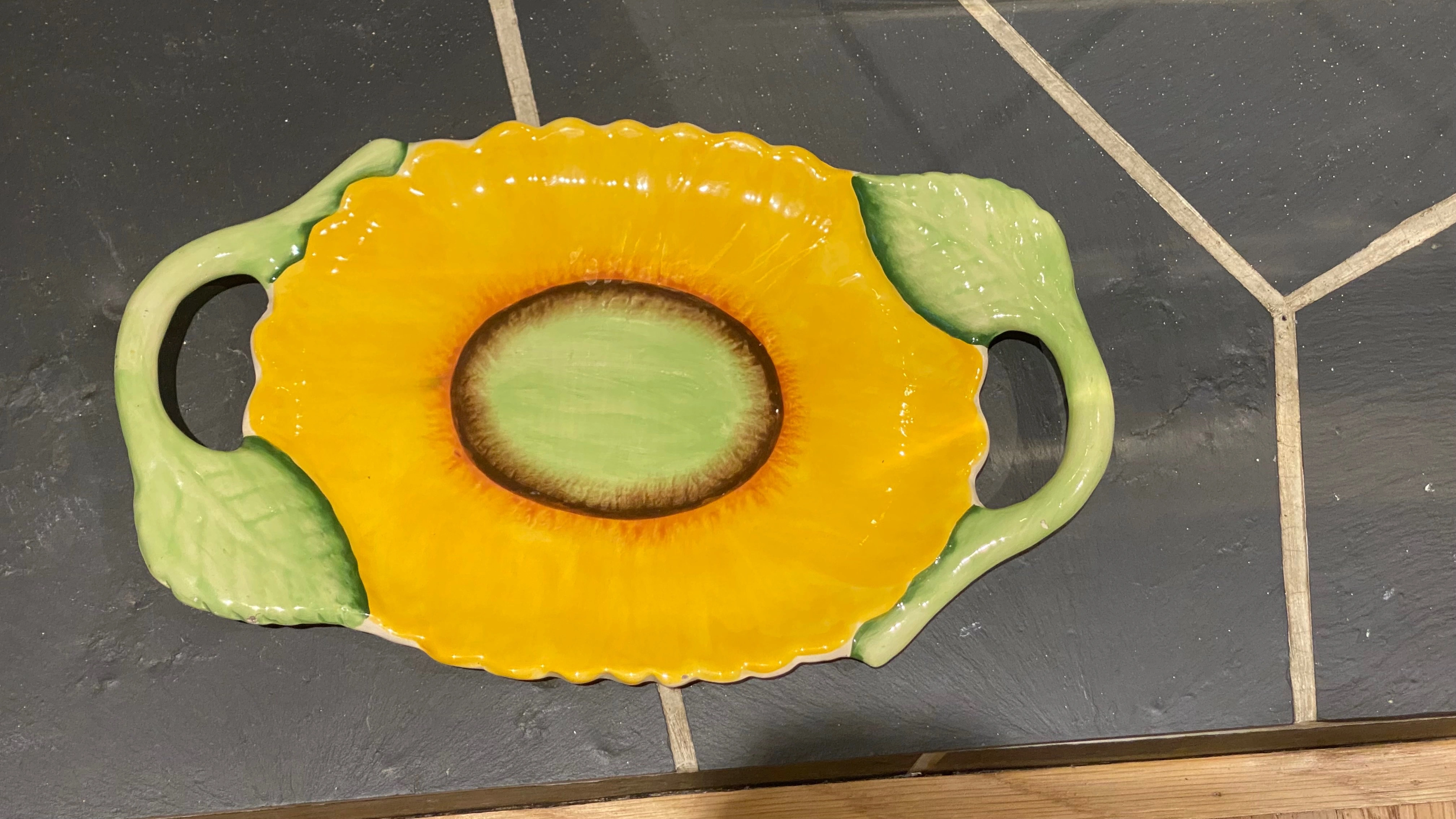 Here's a cute sunflower-shaped serving tray! It's perfect for adding a bit of sunshine to your table. The tray has two handles for easy carrying