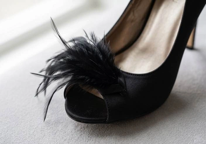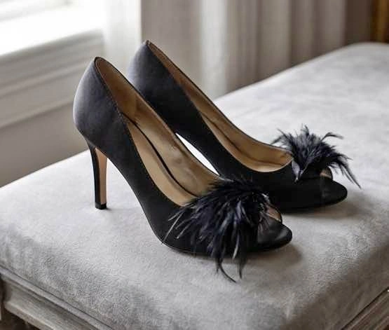 Absolute showstoppers! These Le Château peep-toe stilettos feature a stunning black satin finish and dramatic feather accents. They are the perfect "statement shoe" for your next big event. Brand: Le Château. Size: 7. Style: Peep-Toe Stiletto with Feather Detail. Condition: Excellent, very clean. Vibe: Perfect for weddings, gala events, date nights, or a Gatsby-themed party.