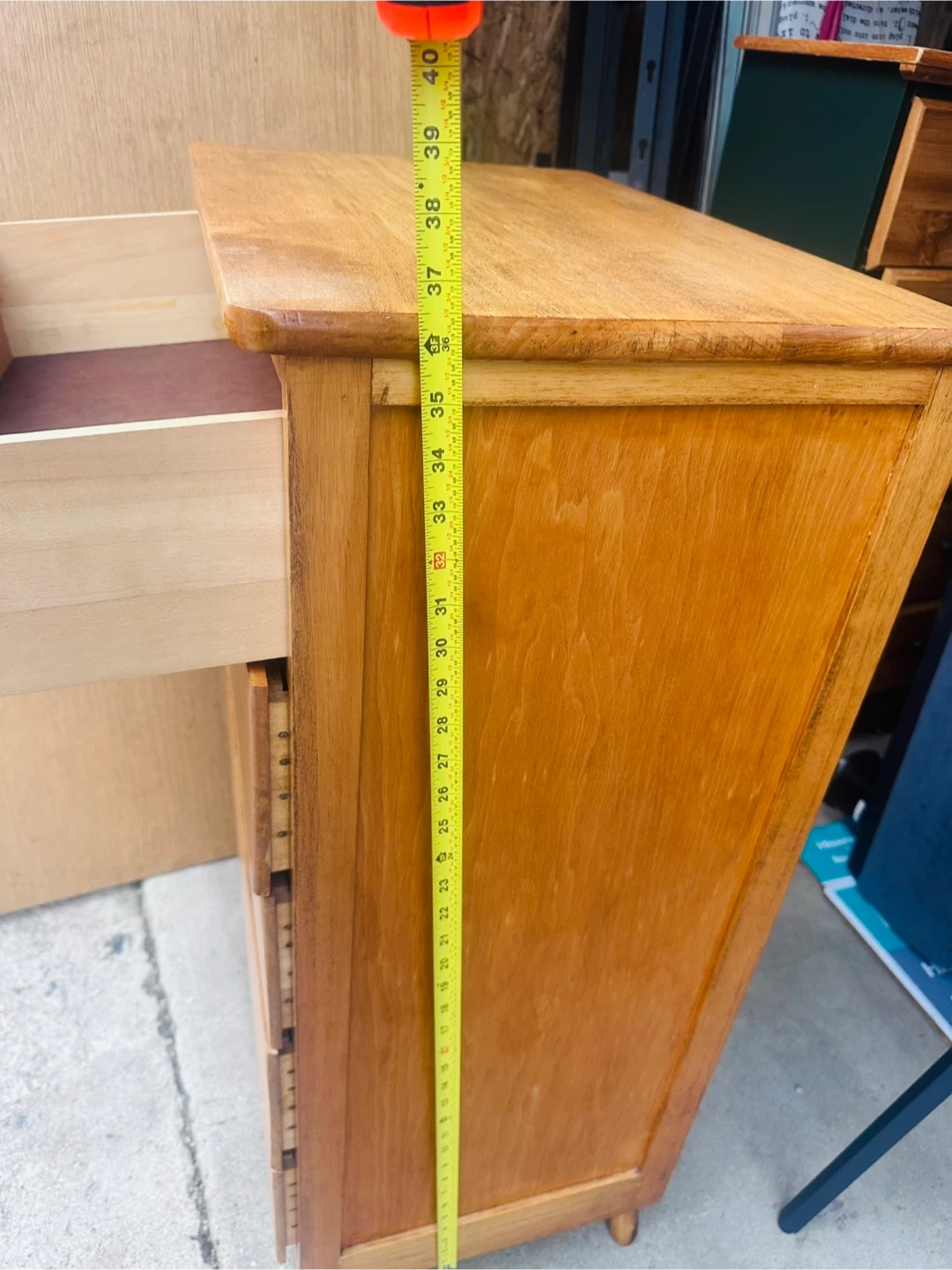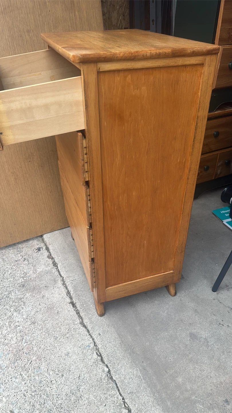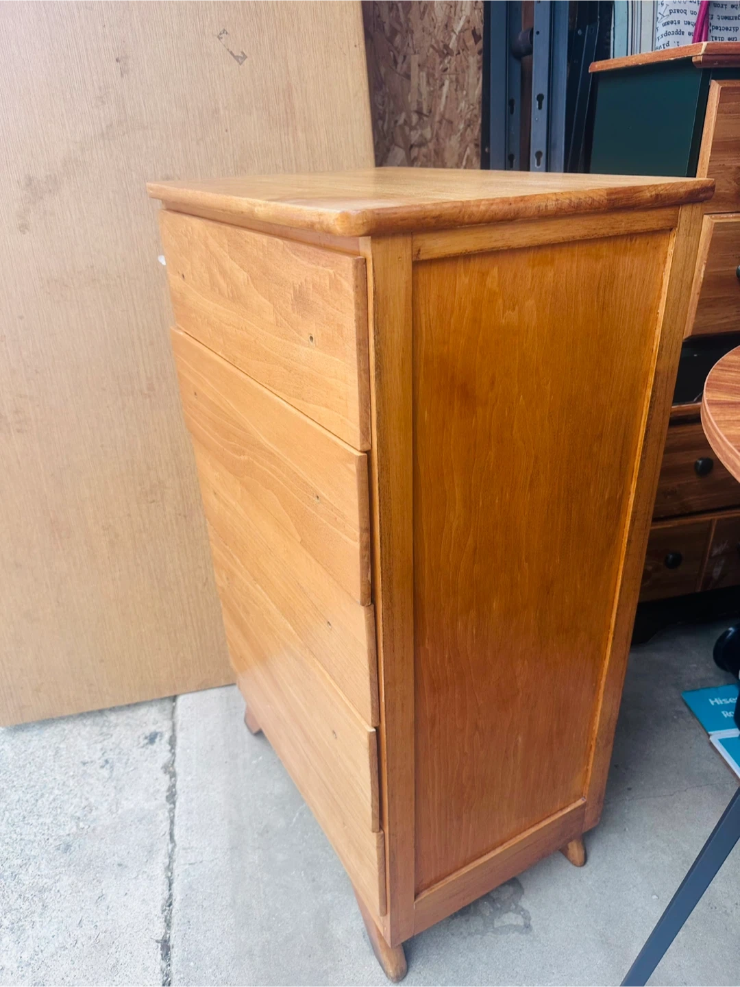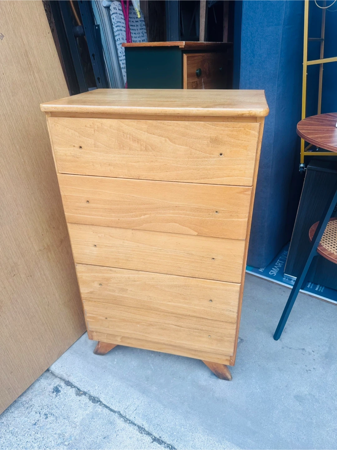 This is a vintage wooden dresser with four drawers. It's made of light-colored wood with a smooth finish. The dresser stands on four short legs.