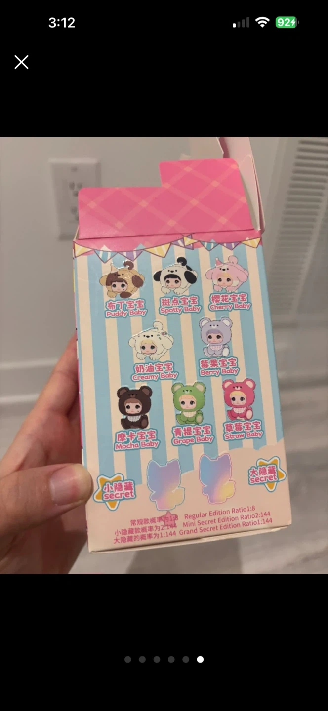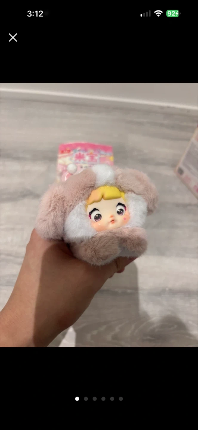 This is a super cute plush toy with a fluffy pink and white exterior, resembling a character with a pink bow. It comes with a white clip and a braided cord keychain. It's a great little accessory for bags or keys!