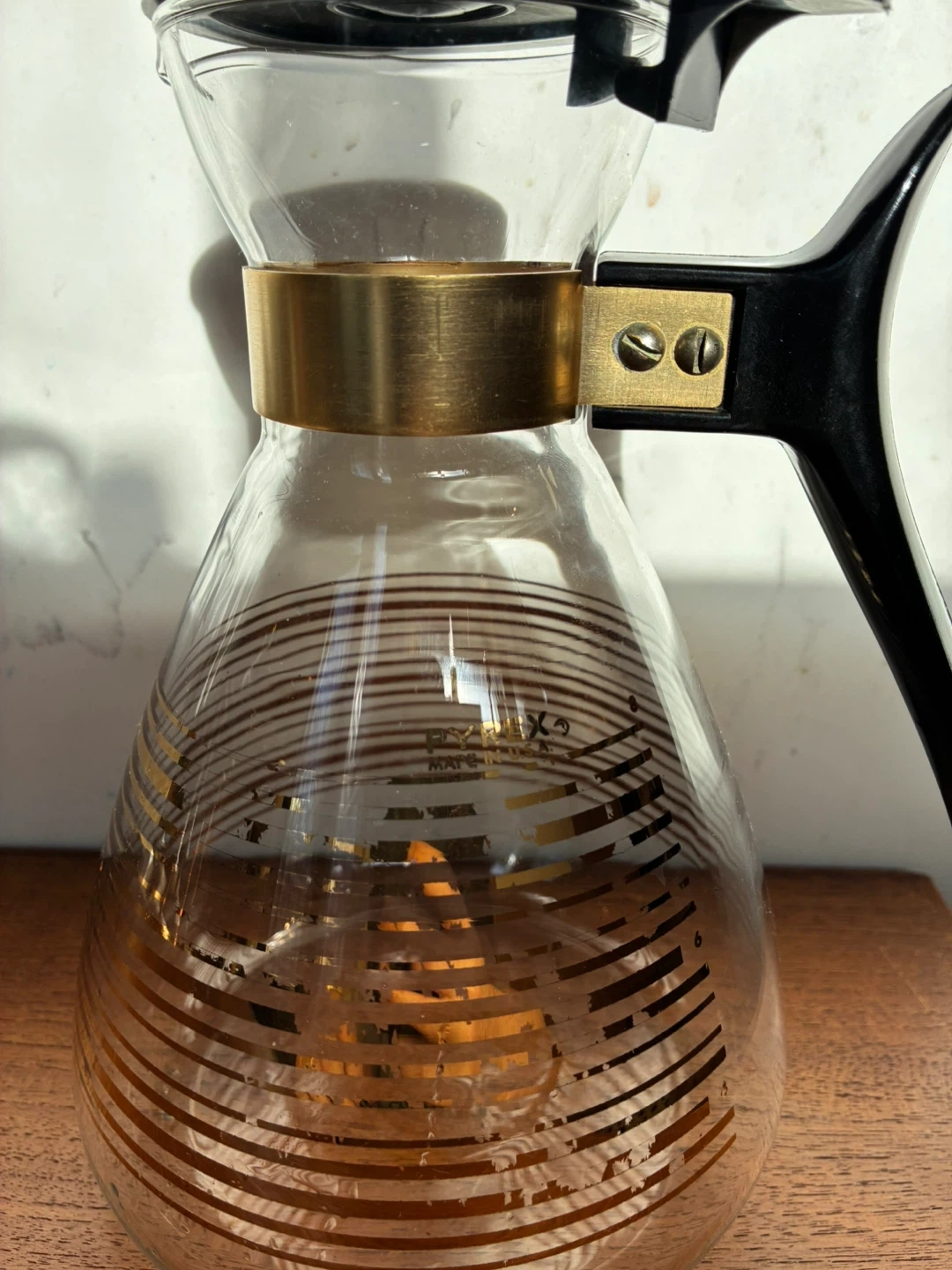 Selling a vintage Pyrex carafe with gold trim! It's in great shape and would look lovely on any table. Perfect for serving coffee or tea with a touch of retro elegance