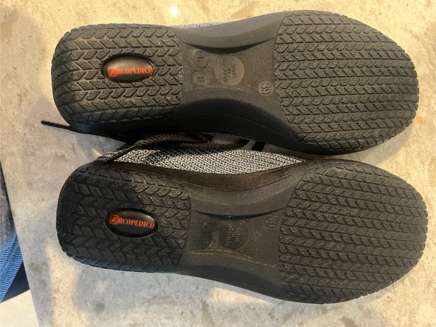 These Arcopedico shoes are made with a light blue knit upper and black laces. The soles are black and feature a durable tread pattern. They are breathable and so comfortable! Retail $300