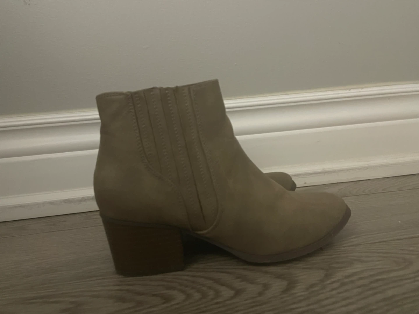 These tan ankle boots feature a stylish block heel and a side zipper for easy wear. They're made of a faux suede material. These boots are great for dressing up or down! Pick up only. Cash only please.
