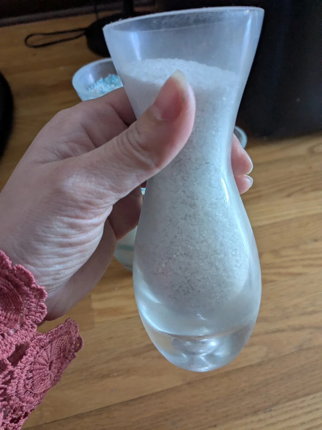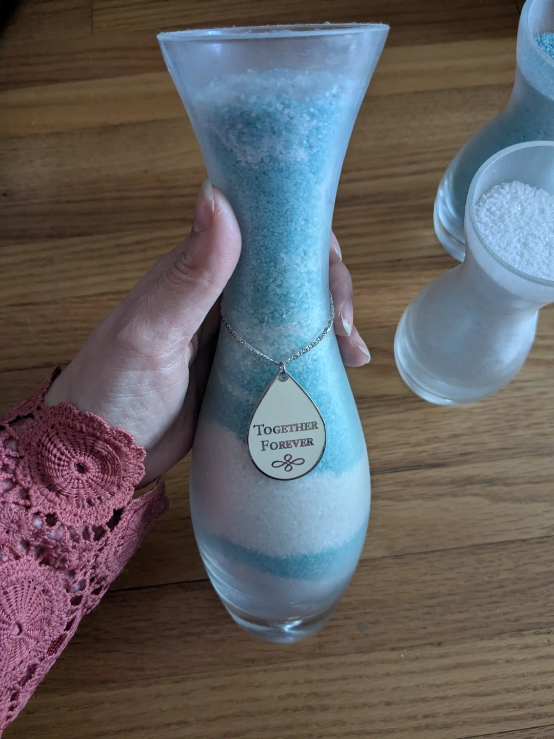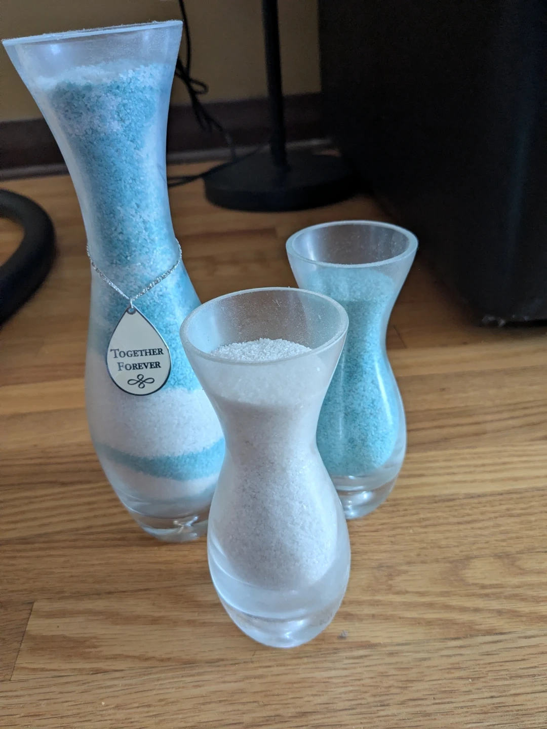 Decorative glass vase set includes one large vase approx 10" height and two smaller vases approx 8" height. Perfect for a wedding/blended family unity ceremony or as a beautiful display piece. No chips or damage just needs a good rinse and fresh sand.