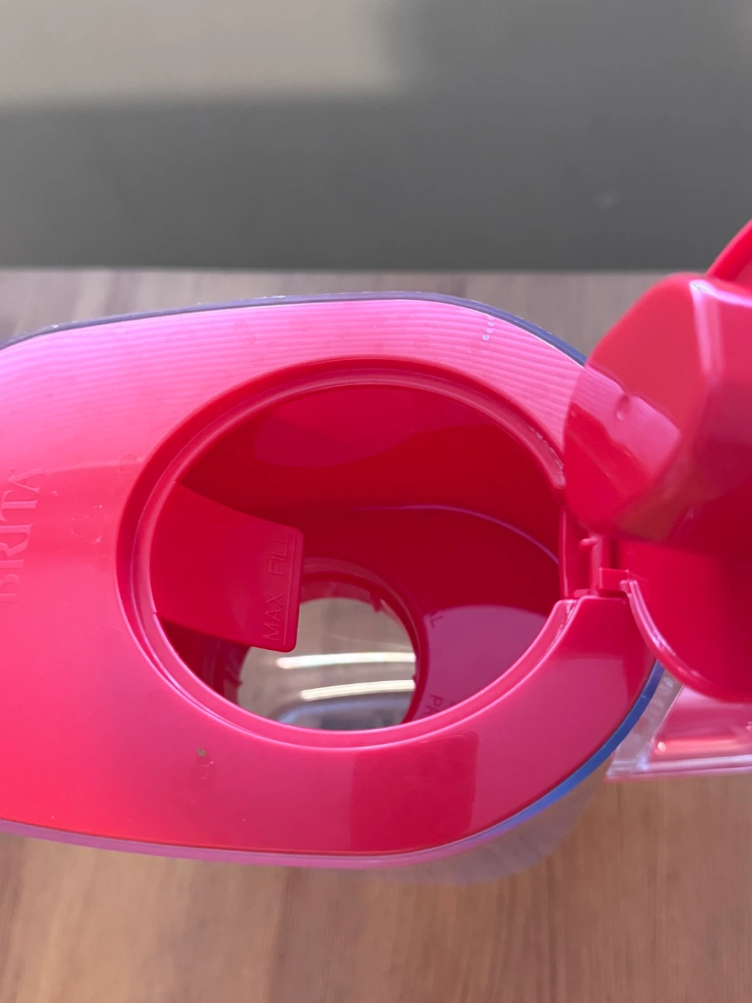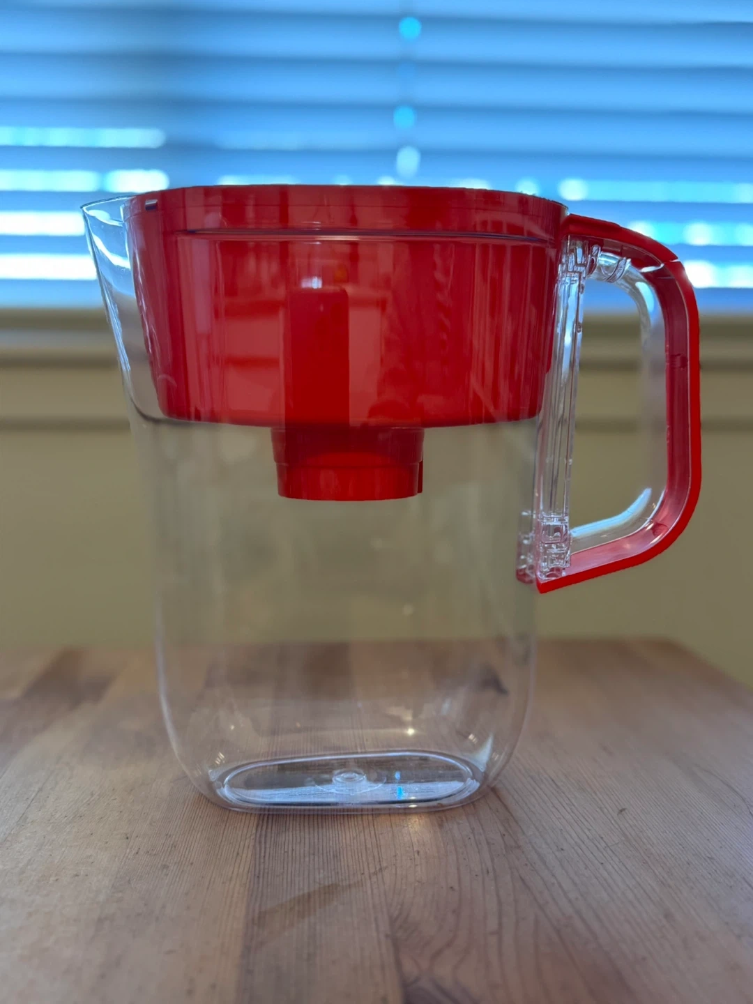 This Brita water filter pitcher comes in a vibrant red colour. It's designed to help you easily filter your drinking water at home. The lid has a reset indicator for filter changes.