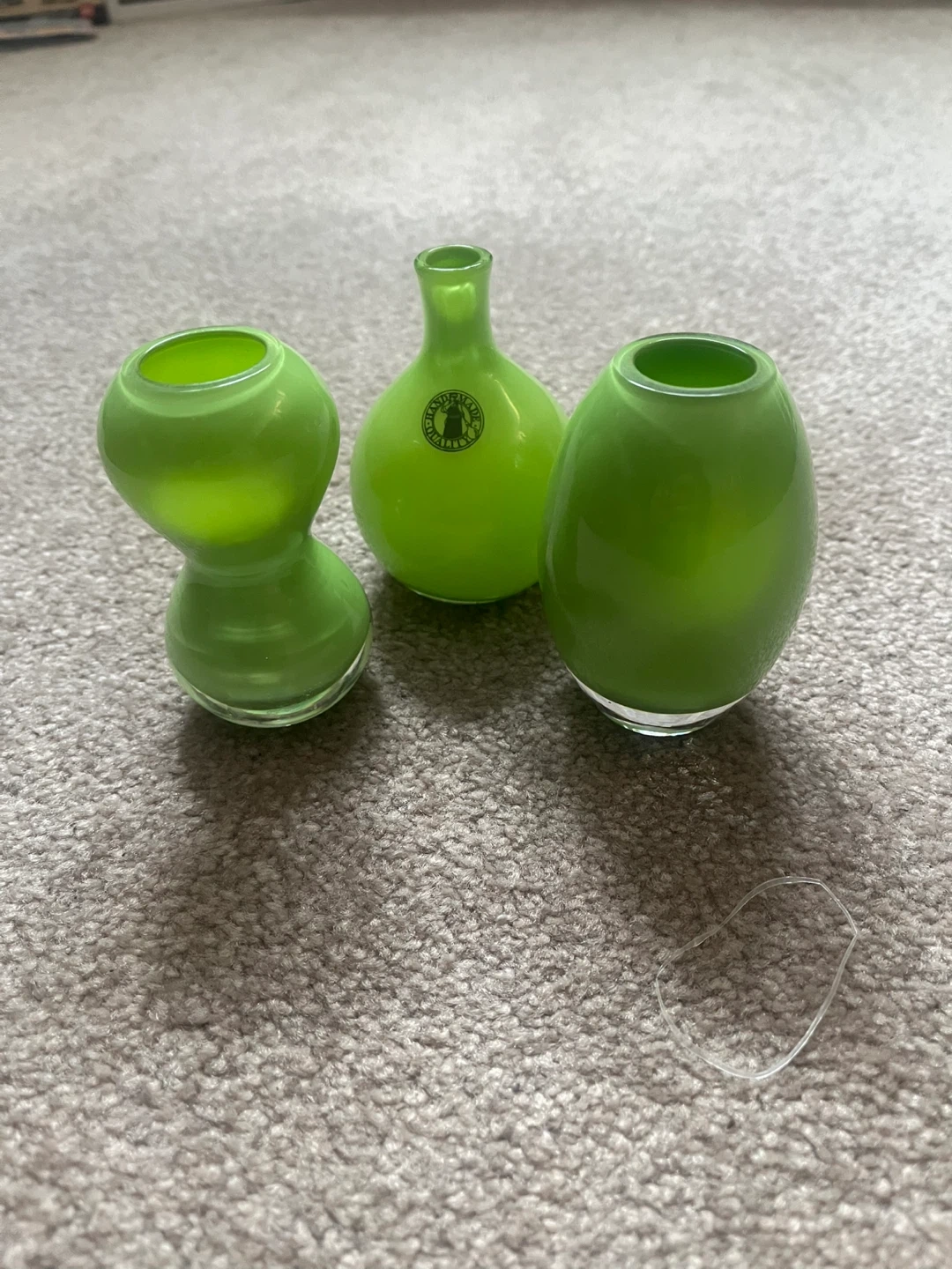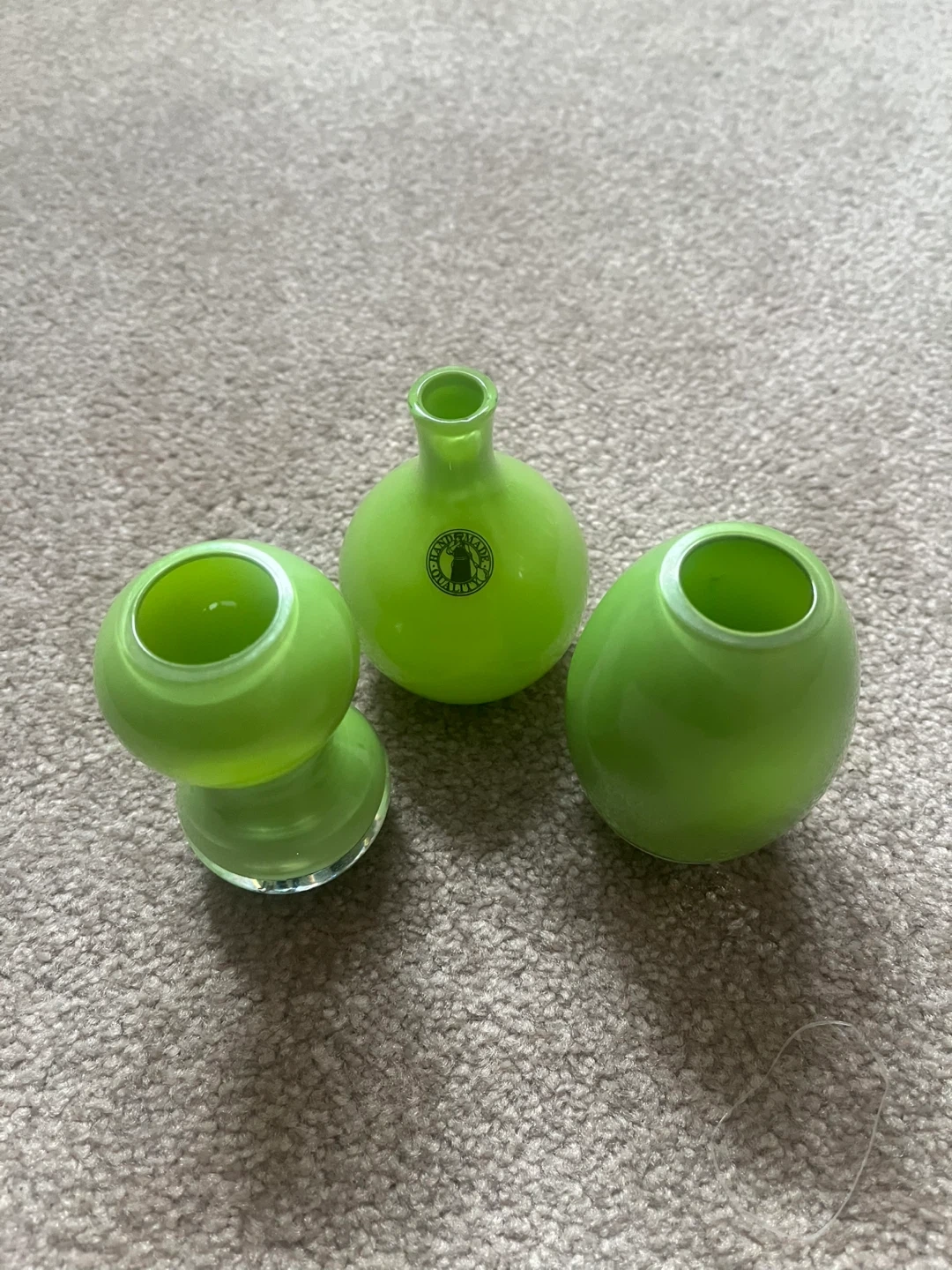 This is a set of three small green glass bud vases. They're made of a vibrant, glossy glass. Perfect for displaying single stems or small floral arrangements.