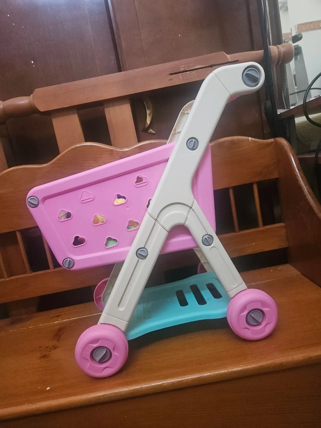 This is a pink and white plastic kids' shopping cart. It comes with a selection of play food items including a sandwich, croissant, pizza slice, and more. Great for pretend play!