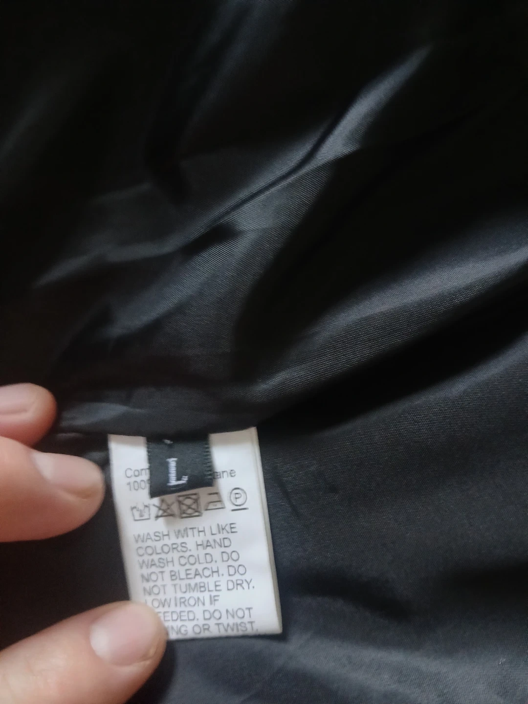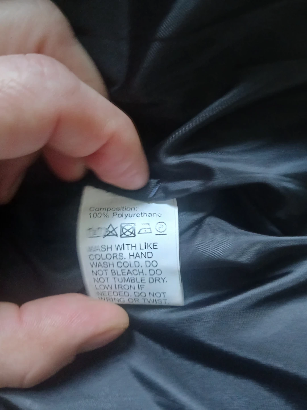 This Toronto Maple Leafs jacket is made of 100% polyurethane. It's a size large with the team logo on the back and sleeve. Wash with like colours, hand wash cold. Do not tumble dry, low iron if needed. Mens large in size. Brand new !!!!!