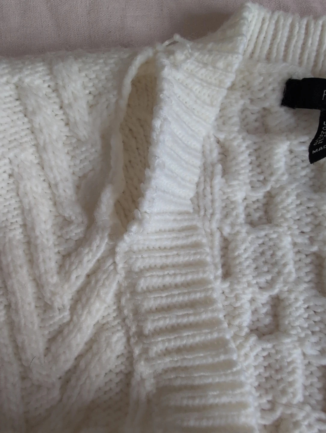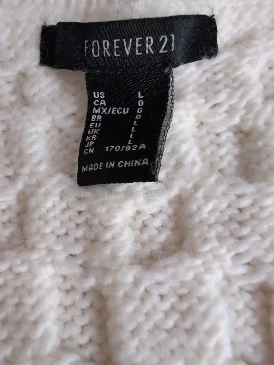 This cream cable knit cardigan from Forever 21 features a classic v-neck and buttonless front. It's a size large with a textured knit pattern throughout. It needs to be fixed near the collar