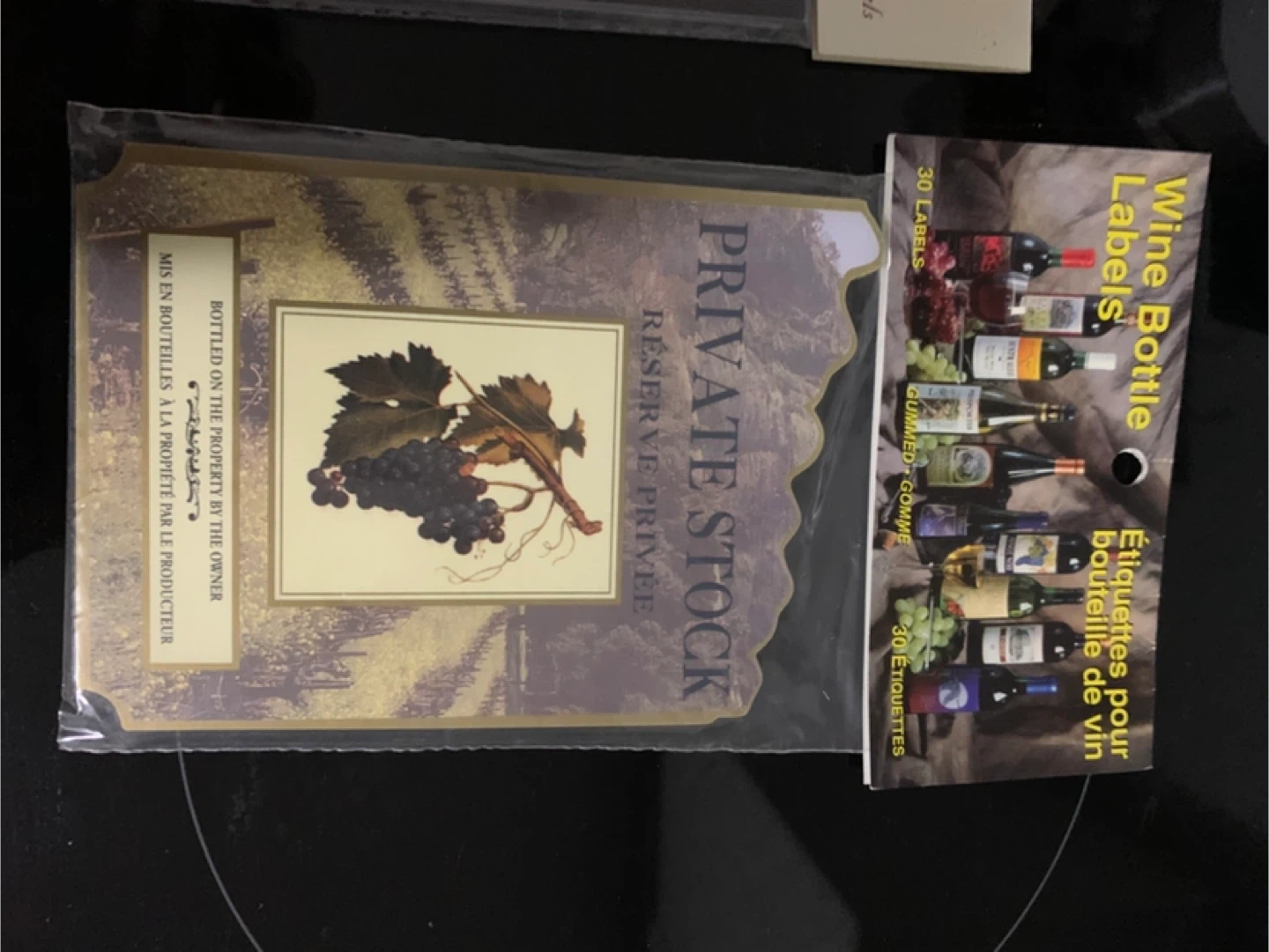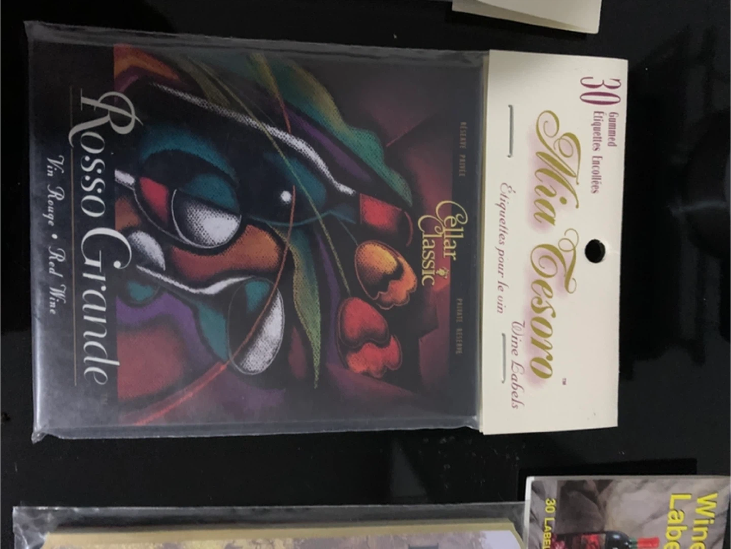 Selling assorted wine bottle labels for wine bottles. Includes "Private Stock Reserve Privée" with grapes, "Montepulciano Selected Wine by the Owner", "Rosso Grande", and "Sirah Special Production". Each package contains 30 gummed labels.