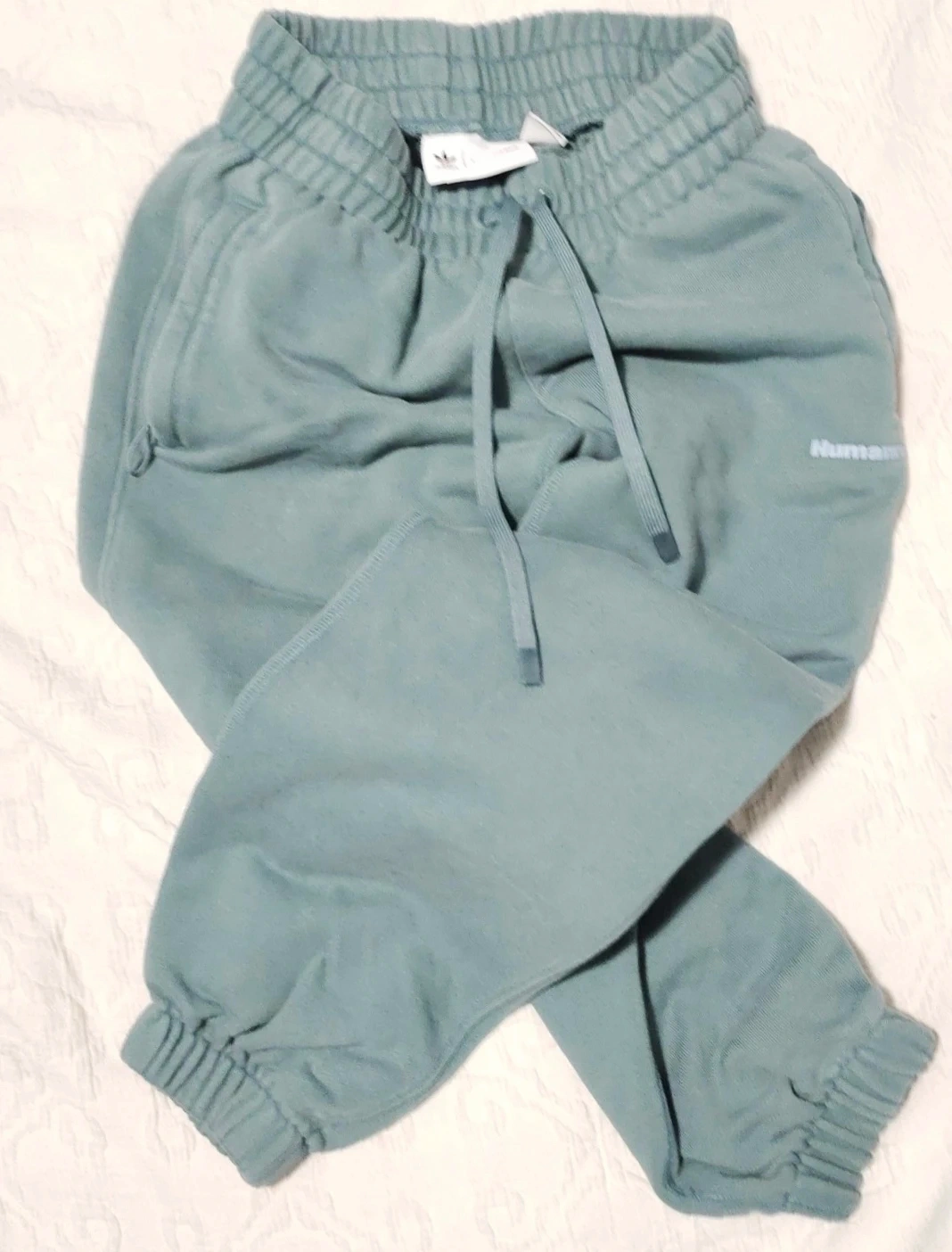 Adidas x Humanrace sweatpants in a nice teal colour. They're size XS and made in Vietnam. Comes with a drawstring waist and zippered pocket. These pants are great for lounging or casual wear!