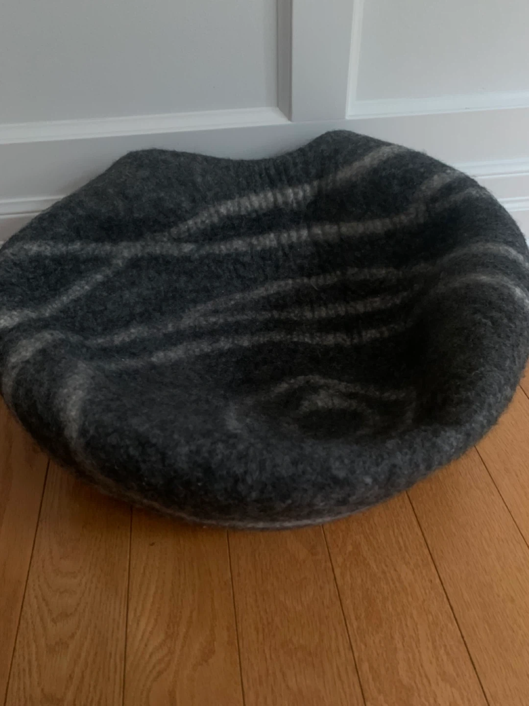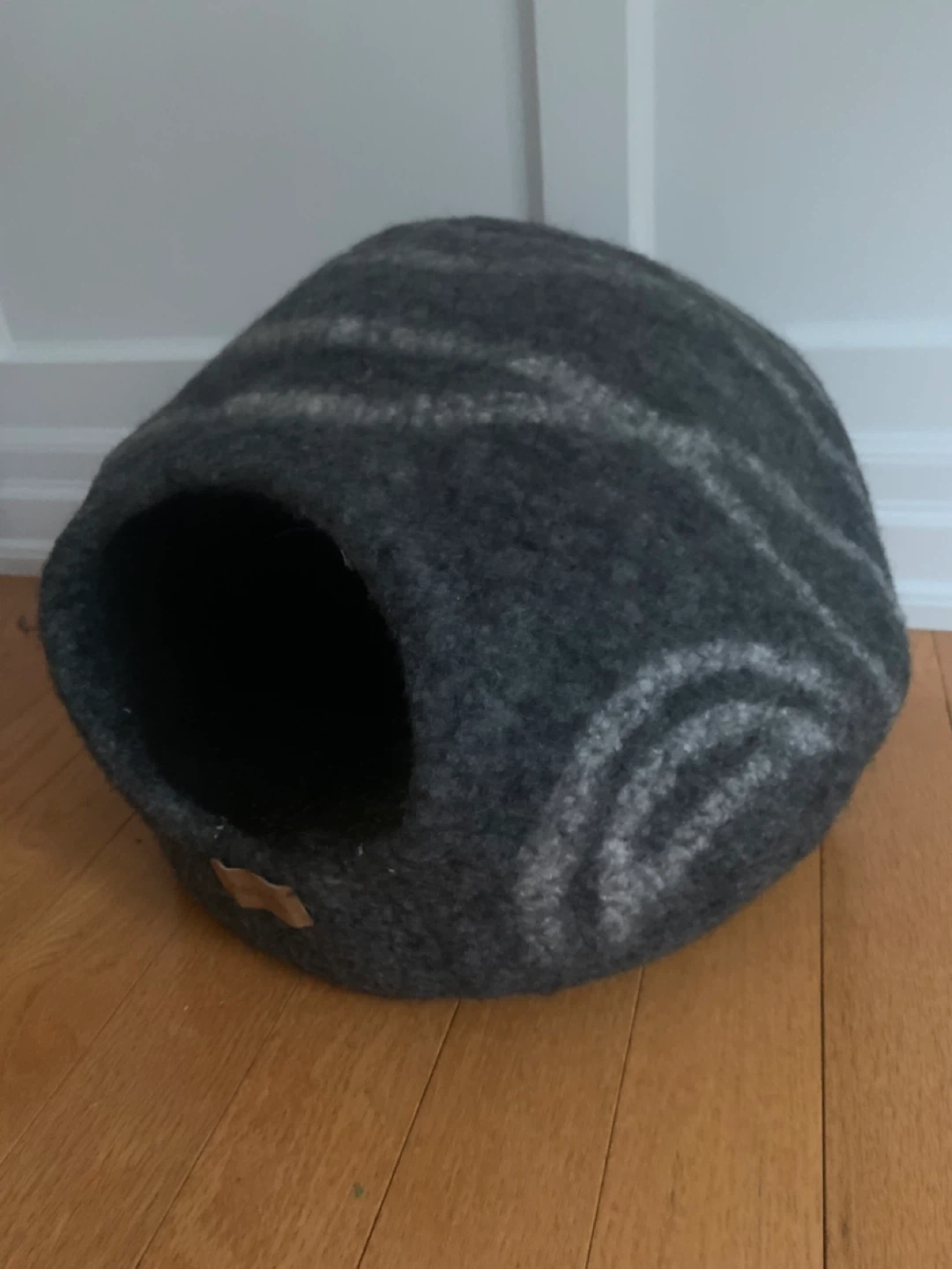 This felt cat bed cave provides a cozy and private space for your feline friend. It's made from durable felt material and features a stylish grey and white striped design. The enclosed cave shape offers security and warmth.
