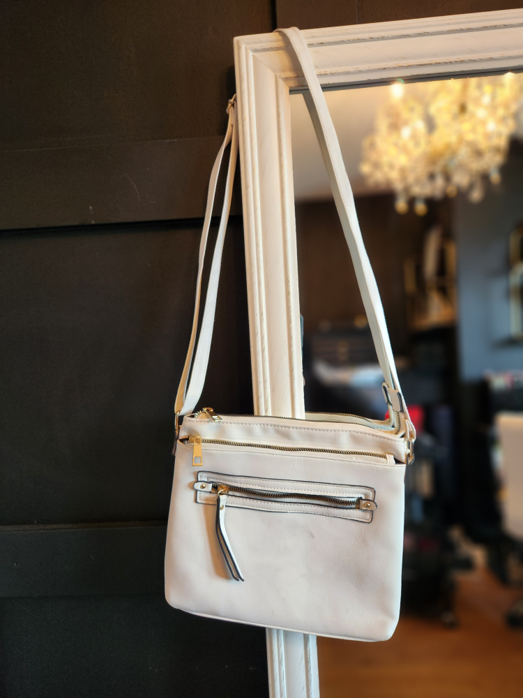 A lovely white crossbody bag! It's in great condition and perfect for carrying your essentials around town. The bag features multiple zippered compartments to keep everything organized and secure.