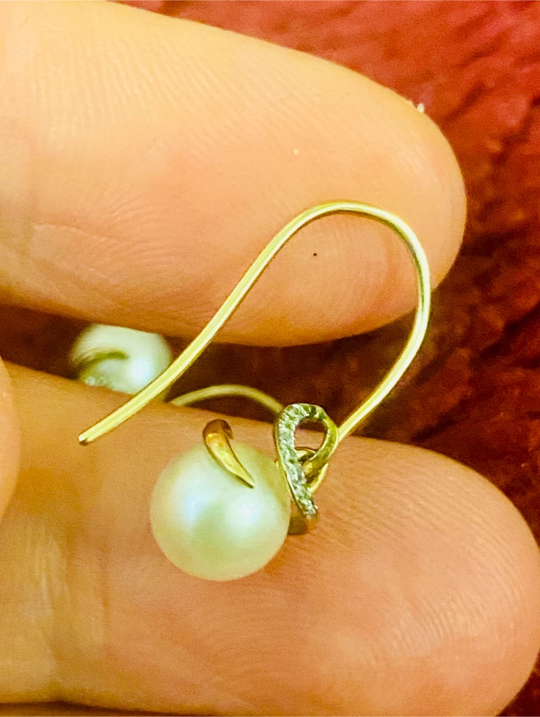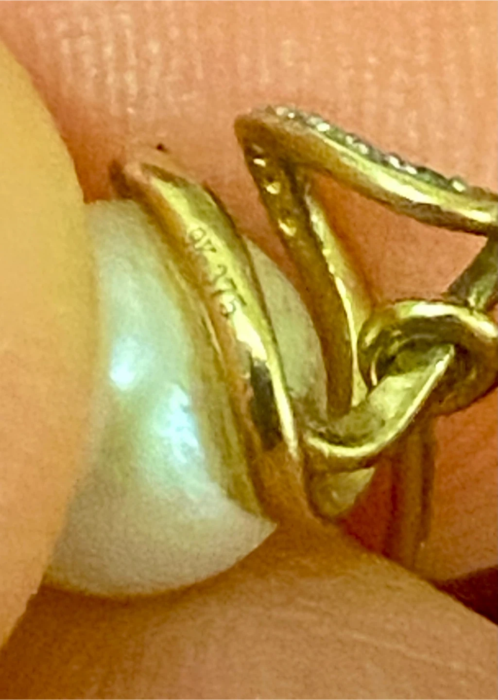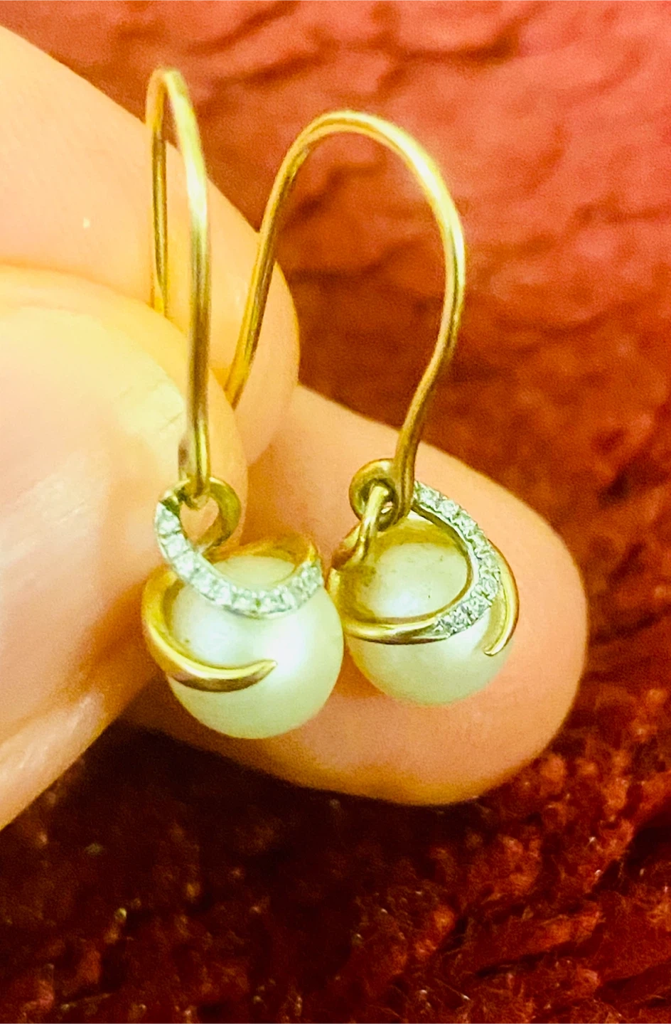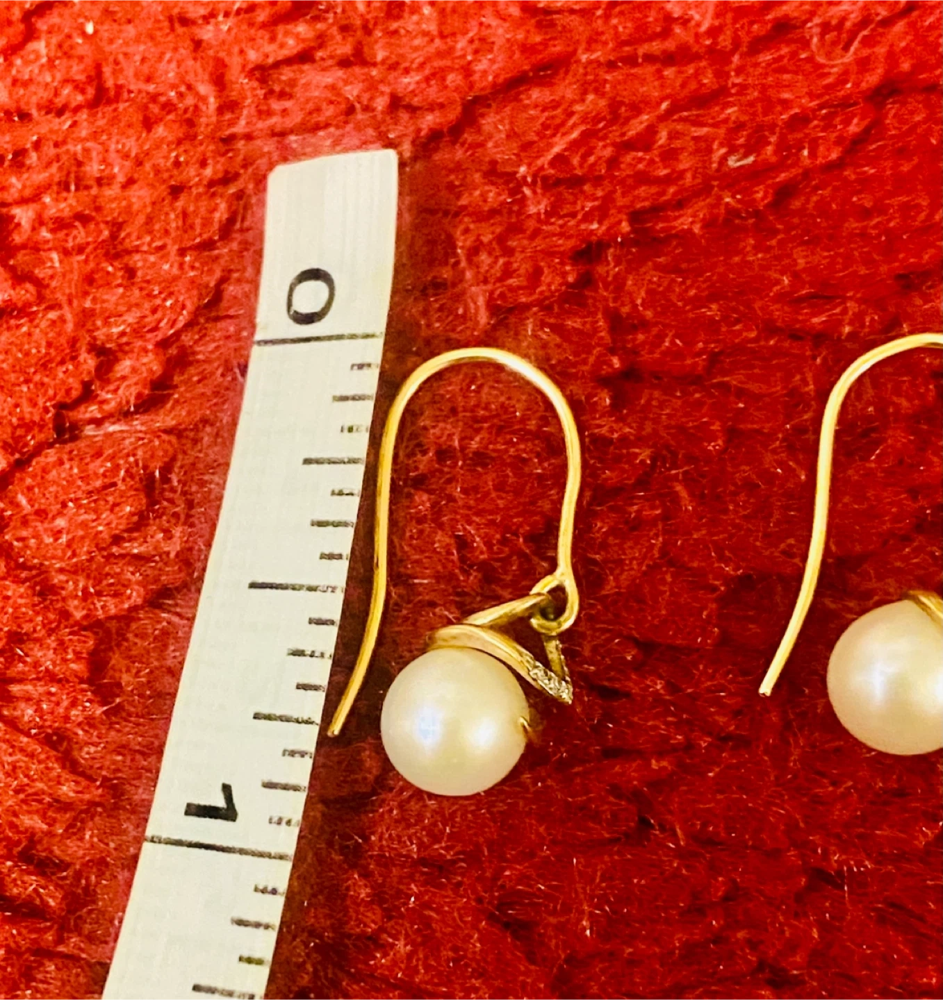 Selling a pair of elegant 9K gold drop earrings featuring lustrous pearls and delicate diamond accents. These earrings are perfect for adding a touch of sophistication to any outfit. The gold is stamped with '9K 375', indicating its purity. They measure approximately 1 inch in length.