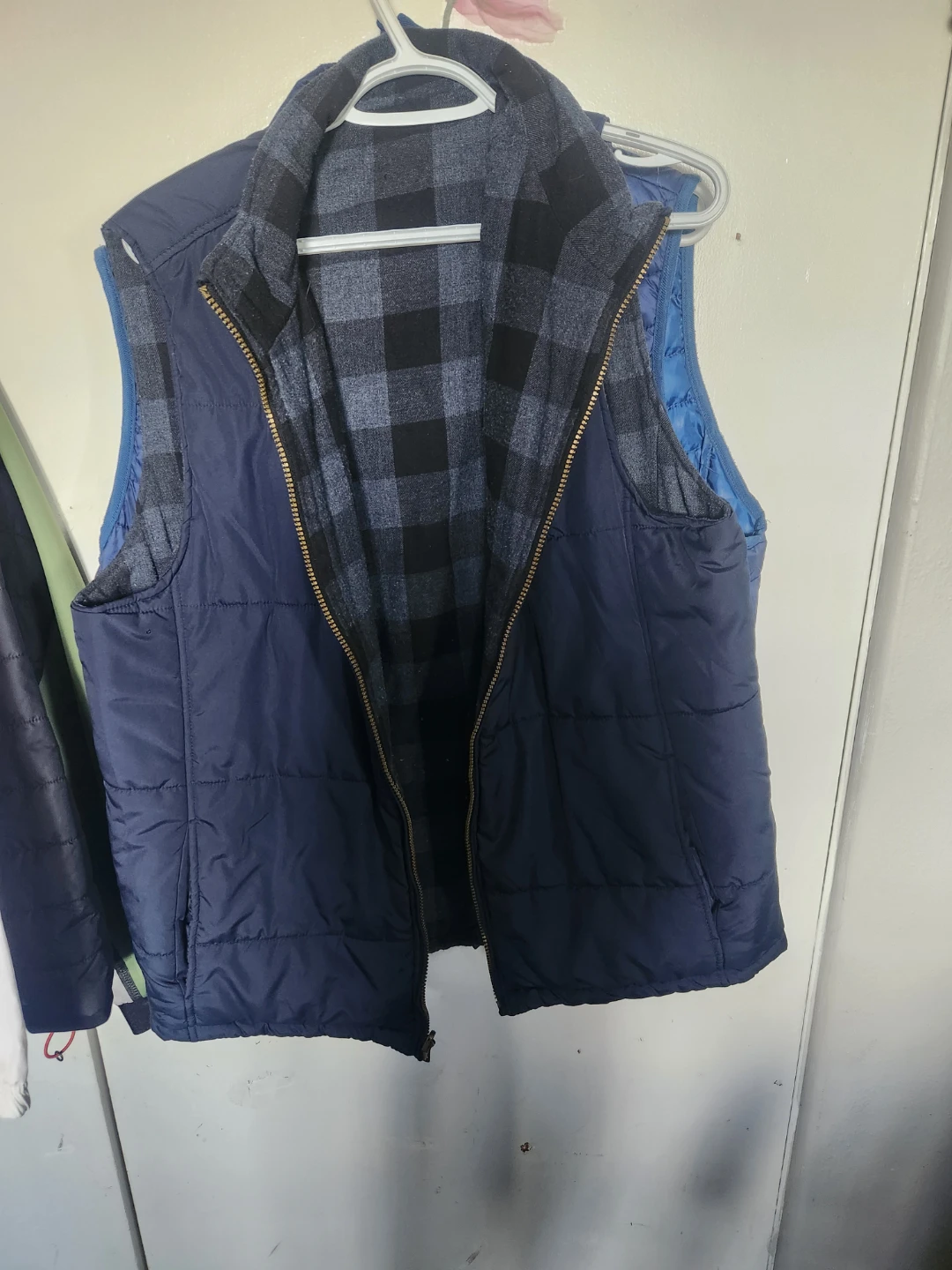 Navy puffer vest with a plaid lining. It's a comfortable layering piece. This vest is perfect for transitional weather.