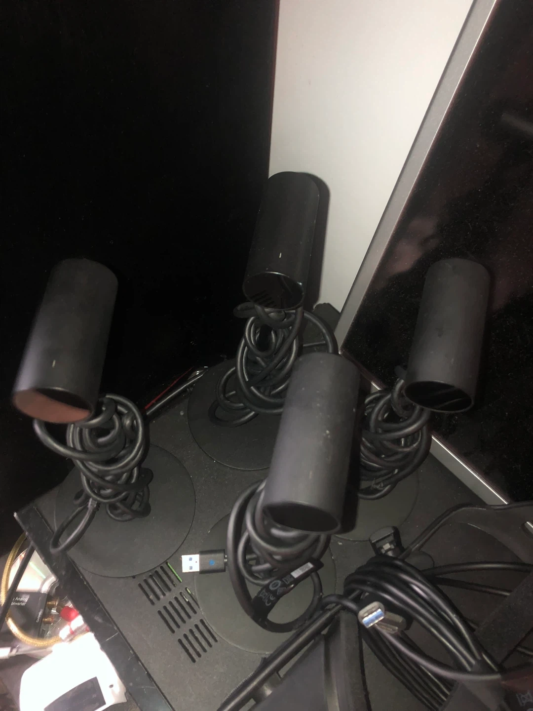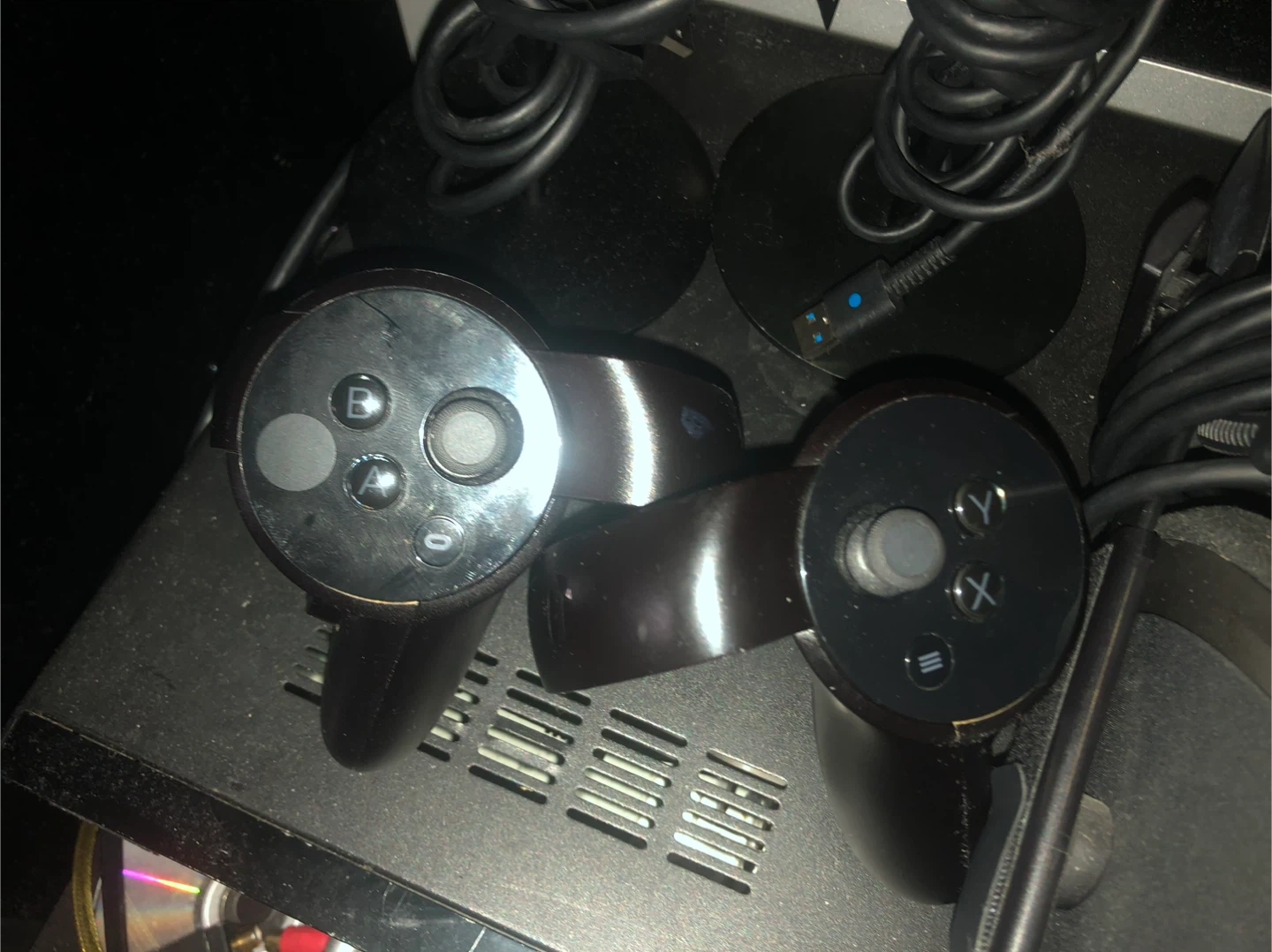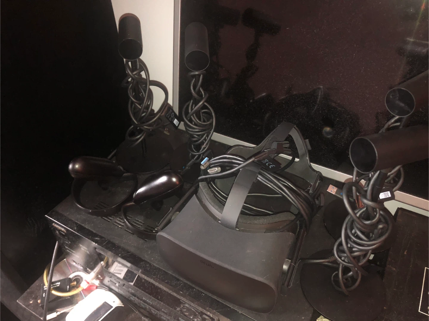 Complete Oculus Rift virtual reality set. Includes the headset, two controllers, and four tracking sensors. Everything you need to jump into VR! All cables are included.