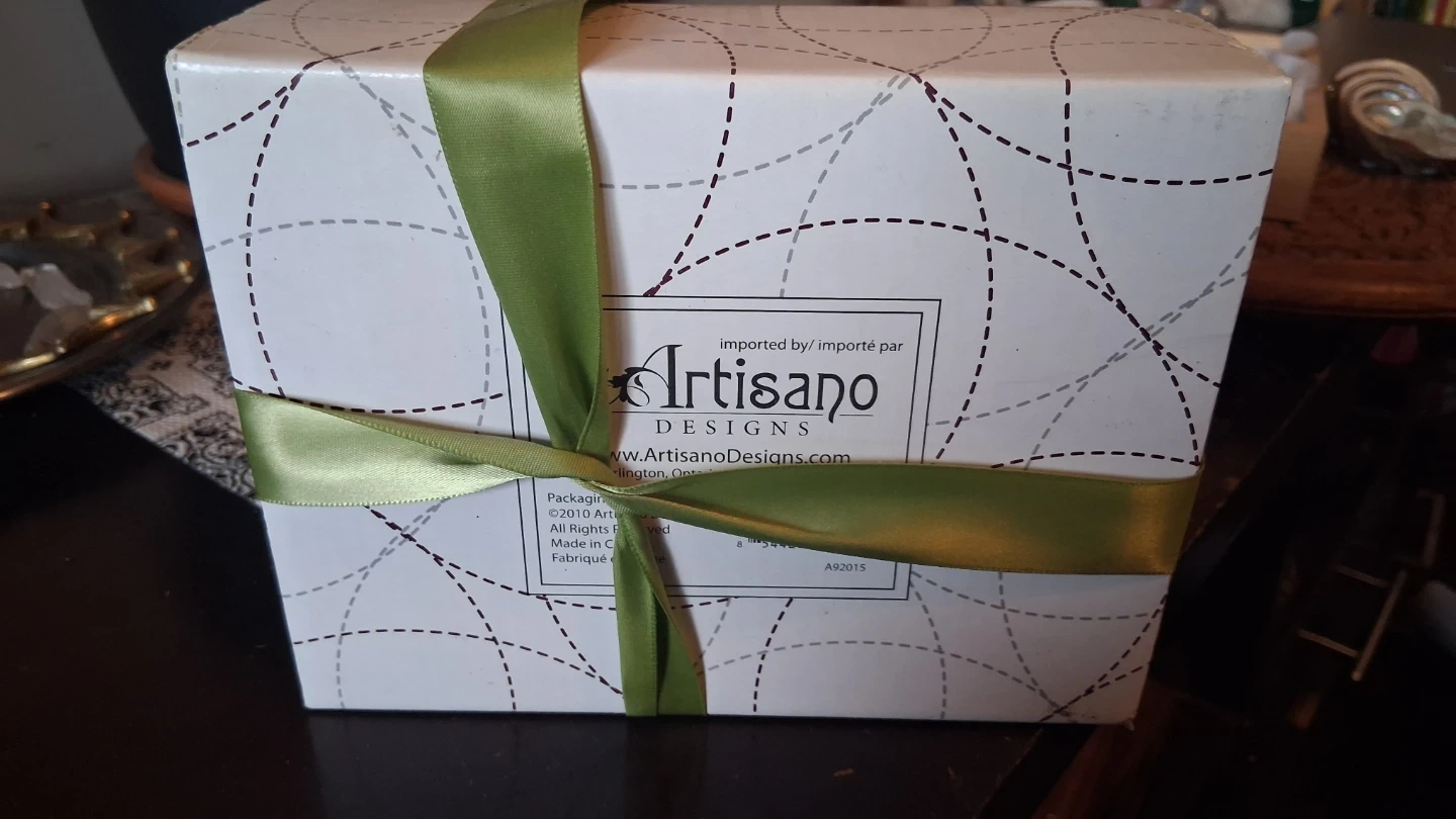 This set includes 2 coffee cups and 2 saucers,, both featuring a "love" design. It's presented in a gift box with a ribbon. Made by Artisano Designs. Never Opened!