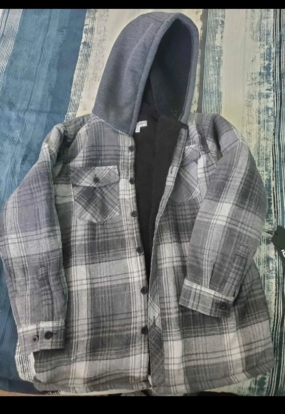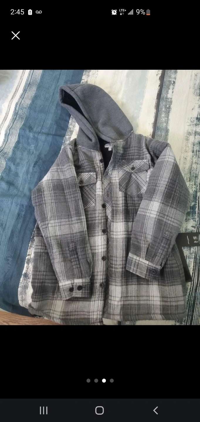 Cozy sherpa-lined flannel shirt jacket with a contrast hood. Features two chest pockets and button-up closure. It's designed for warmth and comfort. Grey and white plaid pattern. Fleece-lined interior. Button closure. Size (L) youth (14-16).