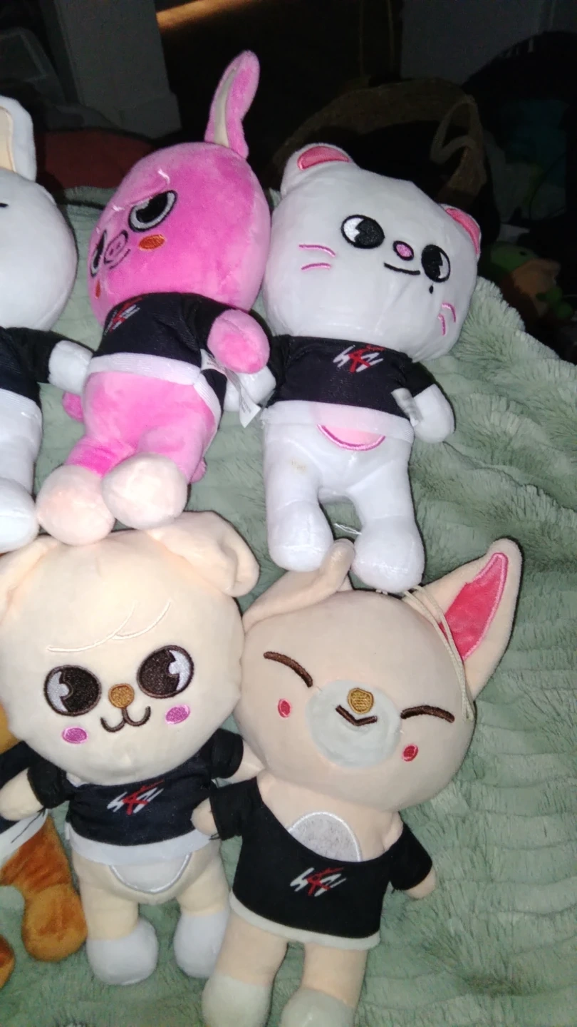 A collection of SKZOO plush toys, featuring characters inspired by Stray Kids members. Each plush is made of soft material and wears a black shirt with a white and red logo.