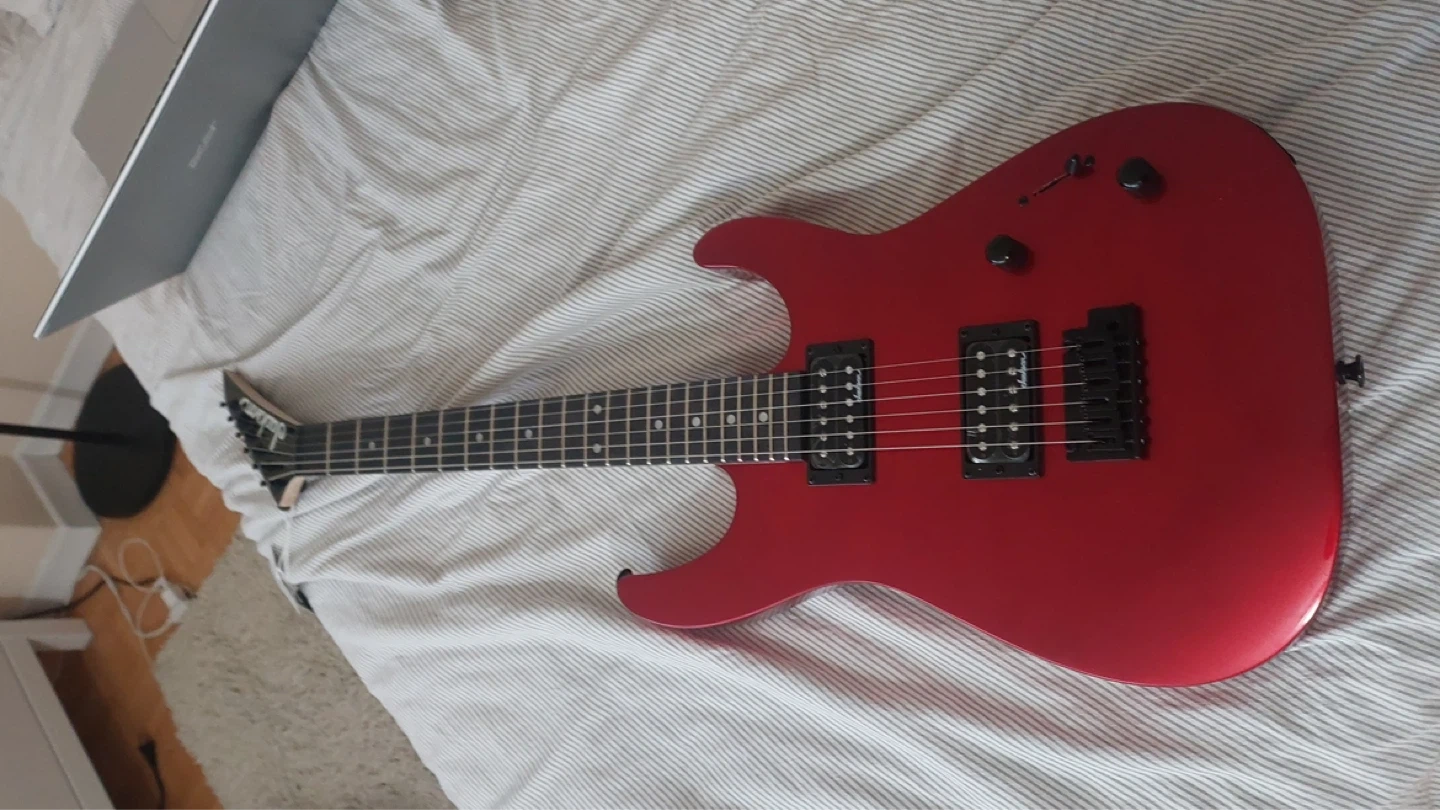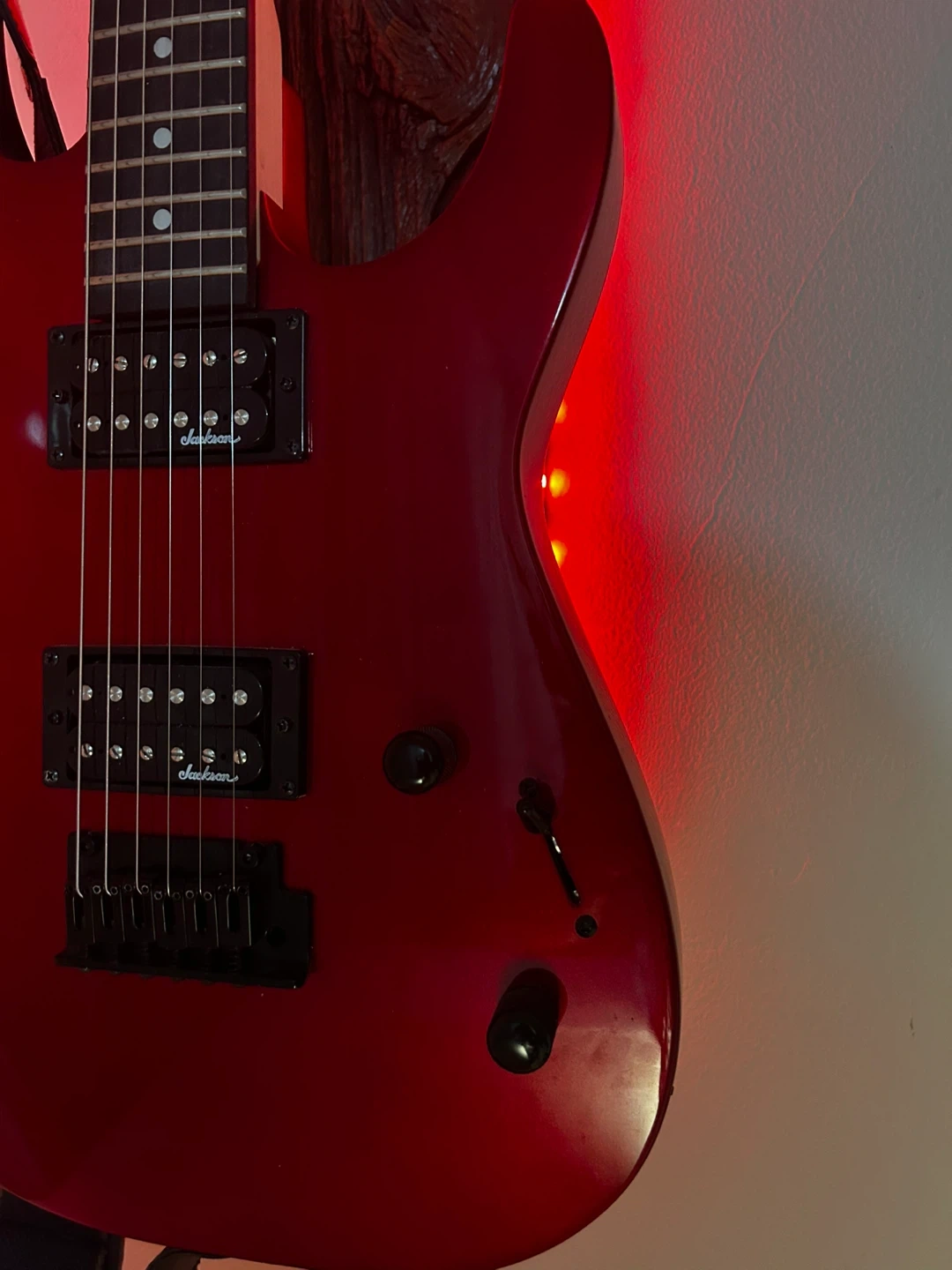 Selling a red Jackson electric guitar. It has two humbucker pickups. This guitar is suitable for rock and metal music.