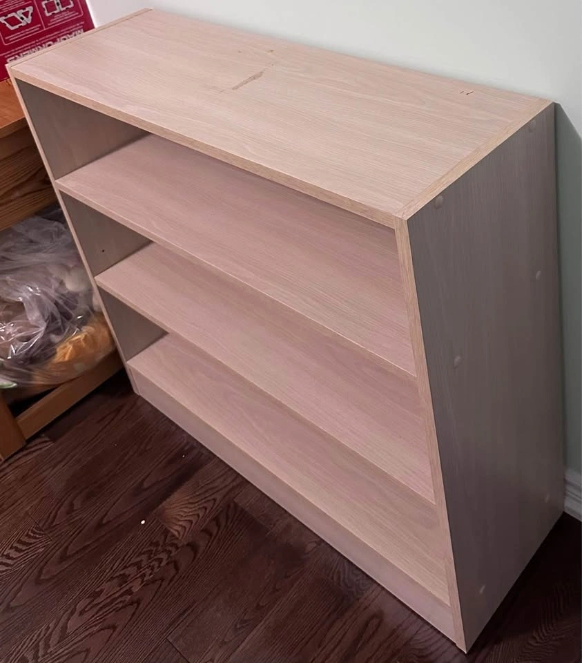 Selling a 3-shelf bookshelf with a light wood finish. Sturdy and functional, perfect for books, decor, or storage. Has some minor cosmetic damage (as shown in photos), but overall in good condition—priced accordingly. Great for home, office, or dorm. Move-out sale – must go. Asking $40. Pickup only.