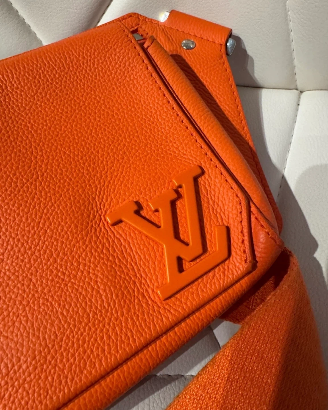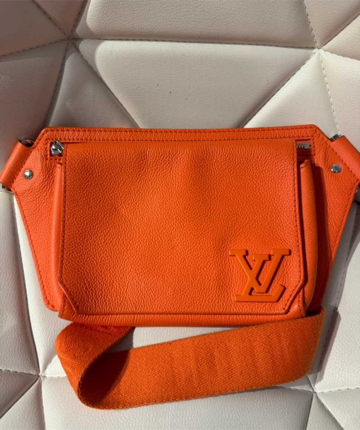This is a Louis Vuitton side bag in a vibrant orange pebbled leather. It features the iconic LV logo embossed on the front. It has a fabric strap for adjustable wear. Comes with dust bag