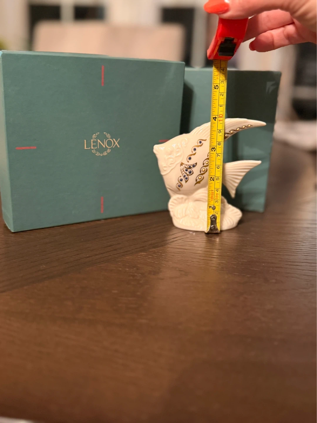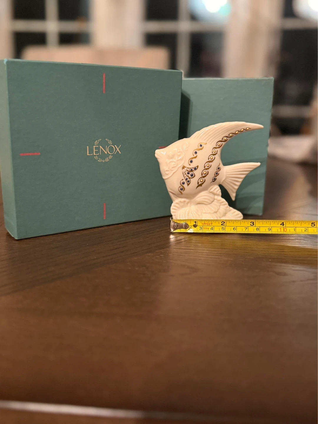 Beautiful Lenox porcelain angelfish figurine. It features intricate detailing and gold accents. Includes original box. Figurine is approximately 5 inches tall.