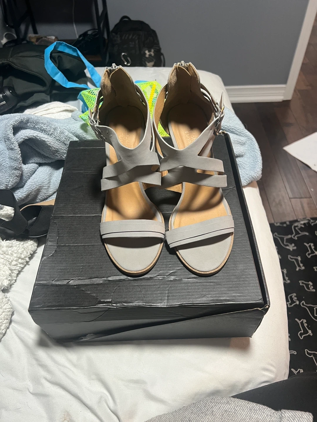 Torrid grey strappy wedge heels with an ankle strap and zipper closure. These shoes are a size 8. They're perfect for dressing up any outfit for a night out or special occasion!