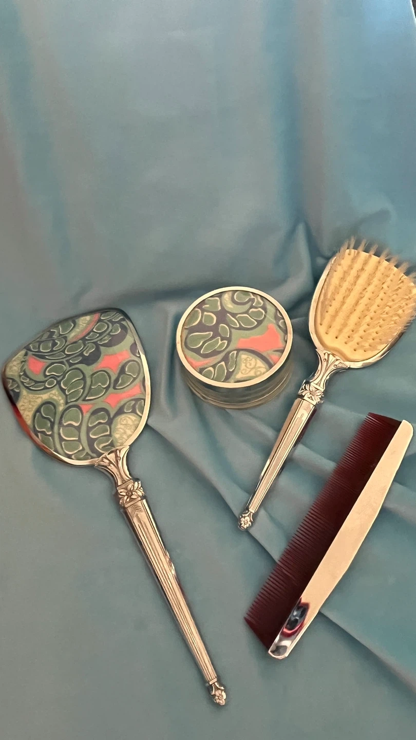 This vintage vanity set includes a hand mirror, a hairbrush, a comb, and a decorative powder case. Each piece features a stylish silver-toned handle and a colourful inlay with a retro pattern. The hairbrush has natural bristles.