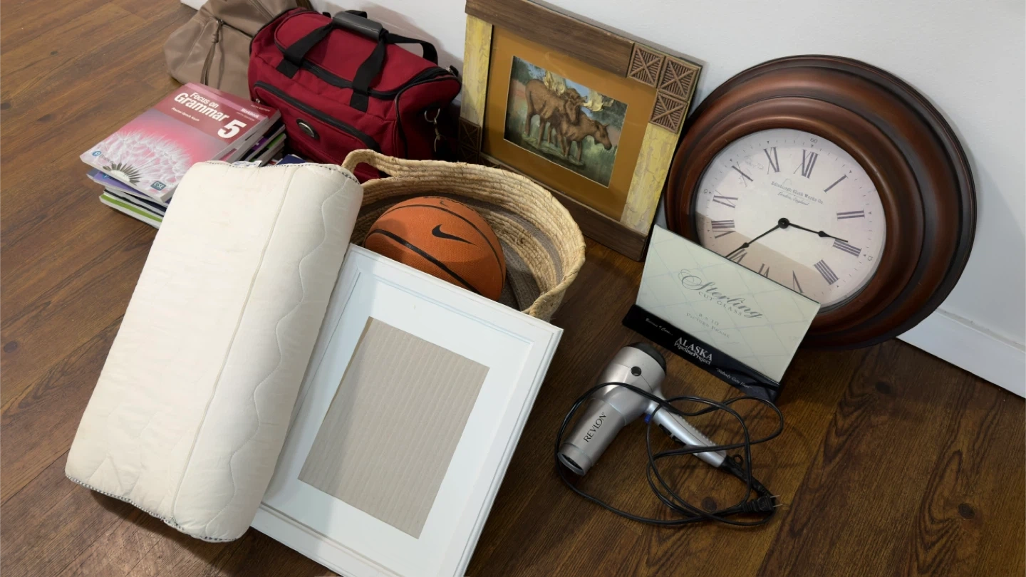 Gently used items for sale. Includes a working clock, a white picture frame, a basketball, some books, a red bag, a hair dryer, and a pillow. Some items have minor signs of use. All in 50$ (Moving sale)
