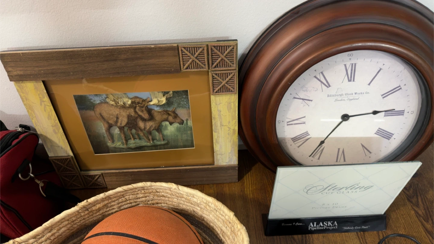 Clock, picture frame, basketball, basketball books, and more