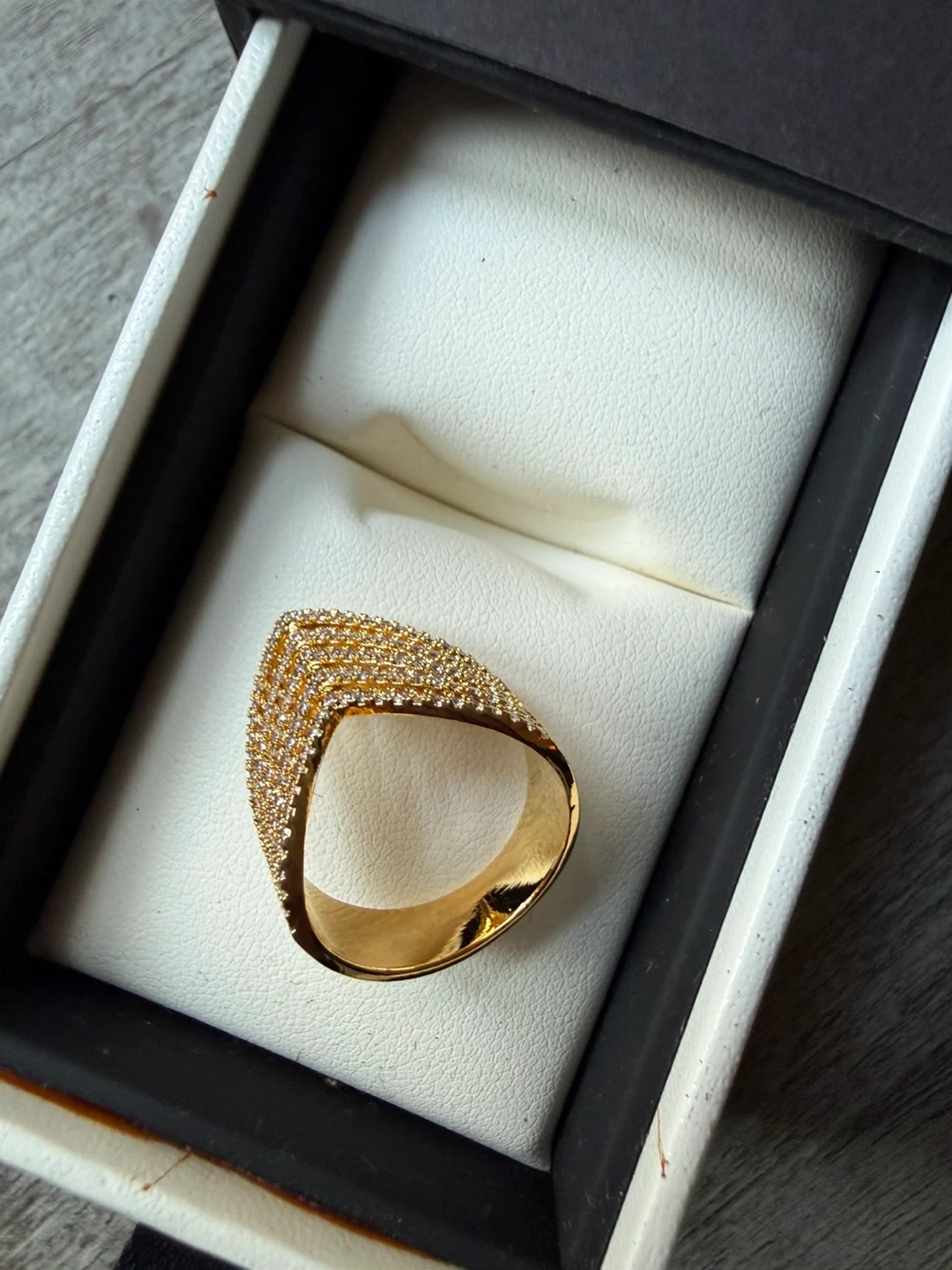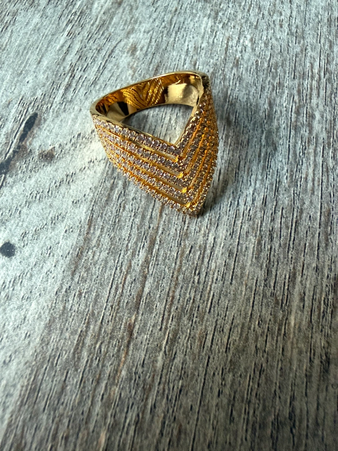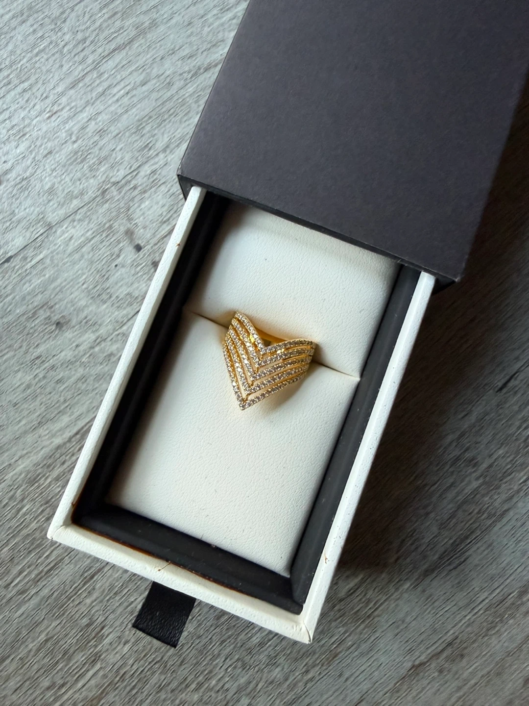 NEW: Gold-tone ring featuring a chevron design. Comes in a black and white presentation box. This ring's eye-catching sparkle makes it a great statement piece for special occasions!