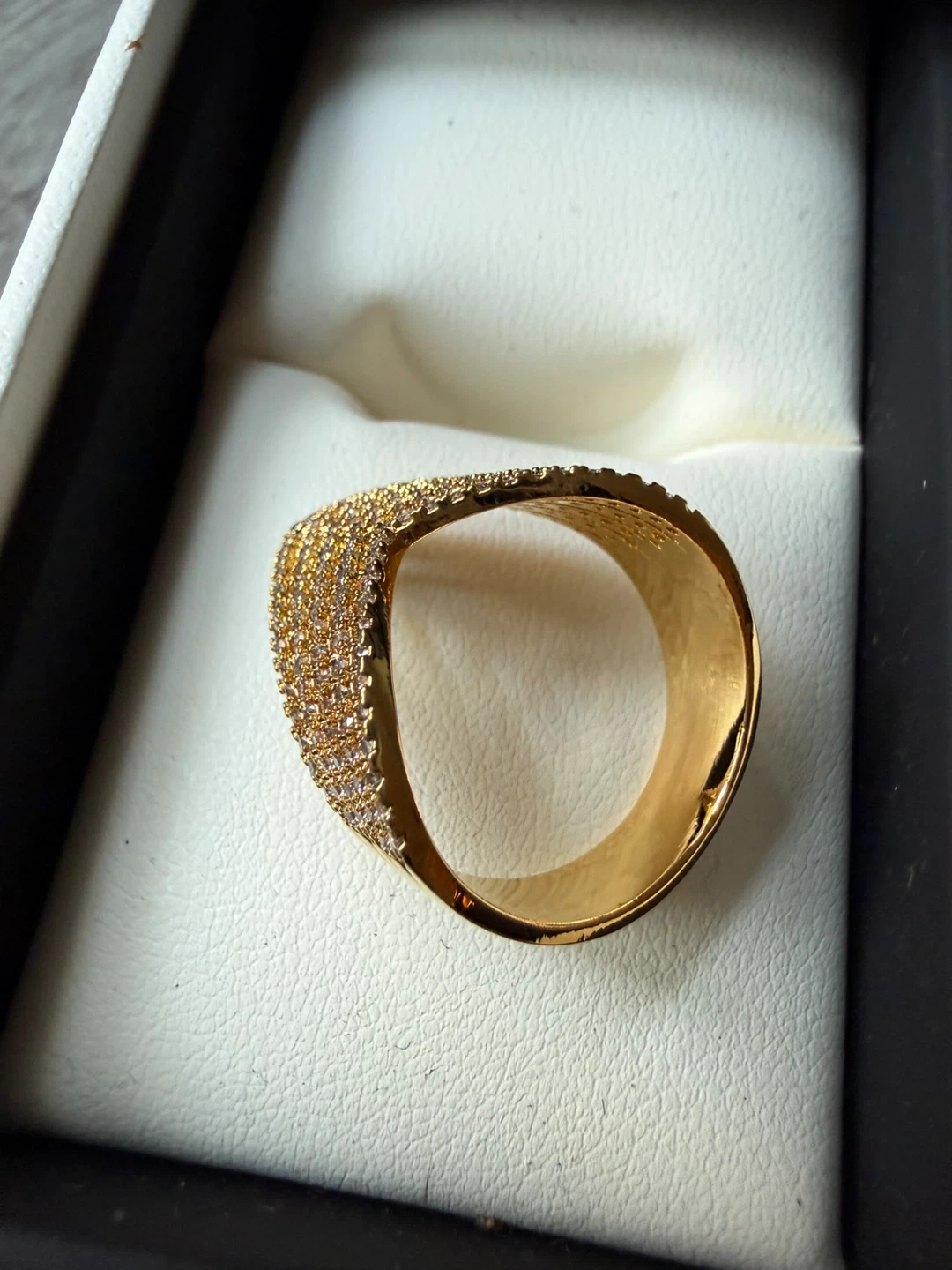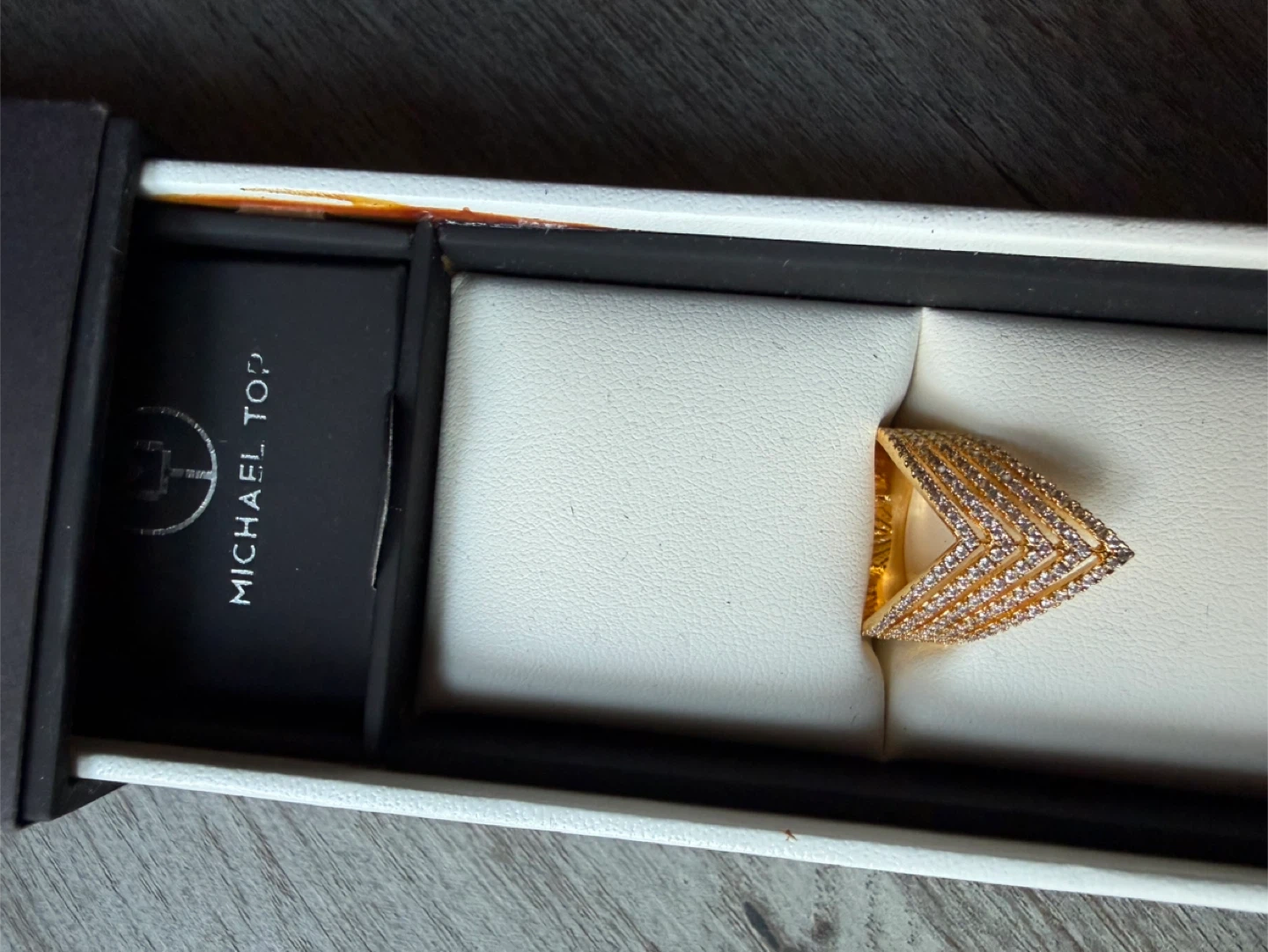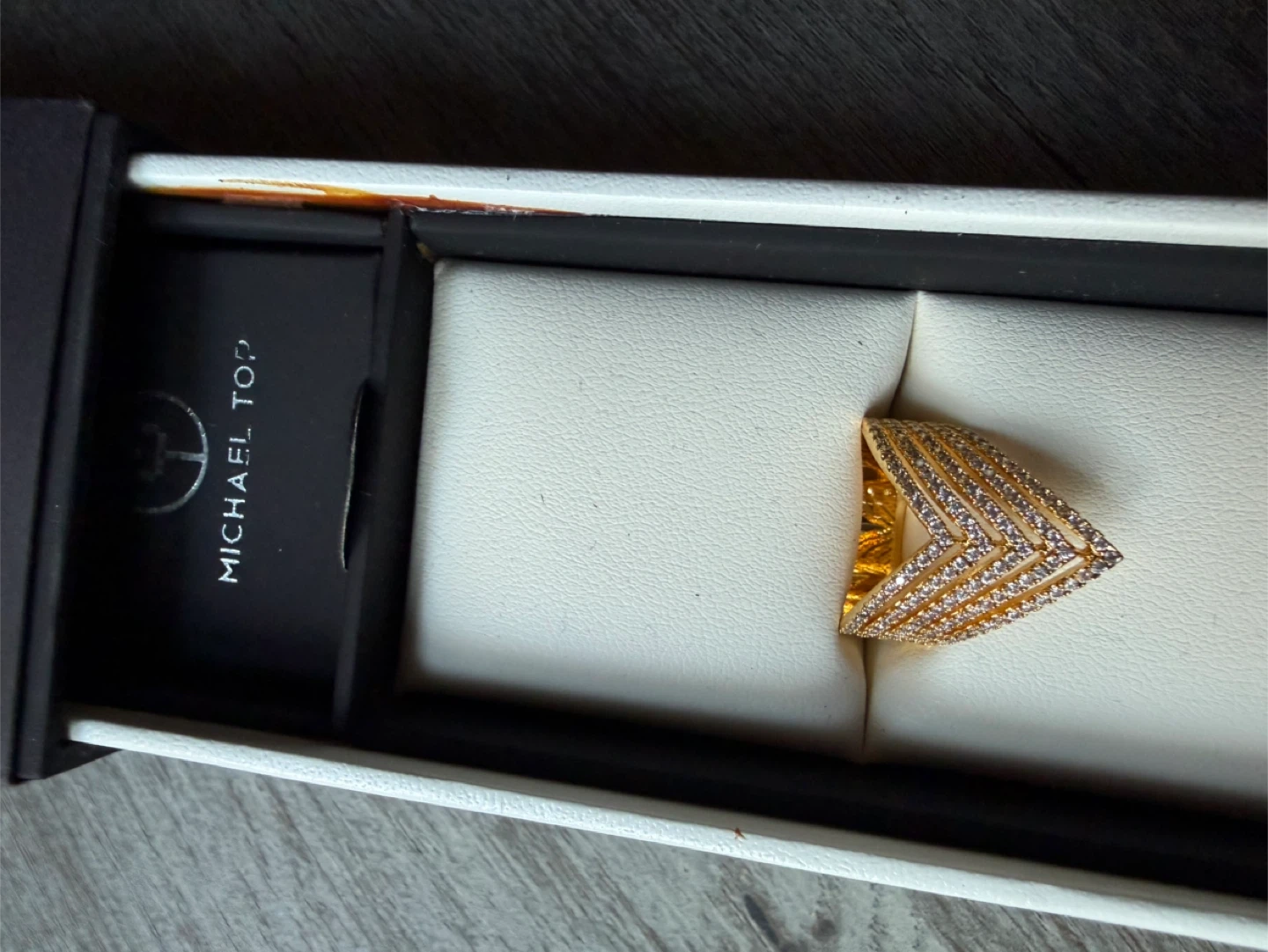 NEW: Gold-tone ring featuring a chevron design. Comes in a black and white presentation box. This ring's eye-catching sparkle makes it a great statement piece for special occasions!