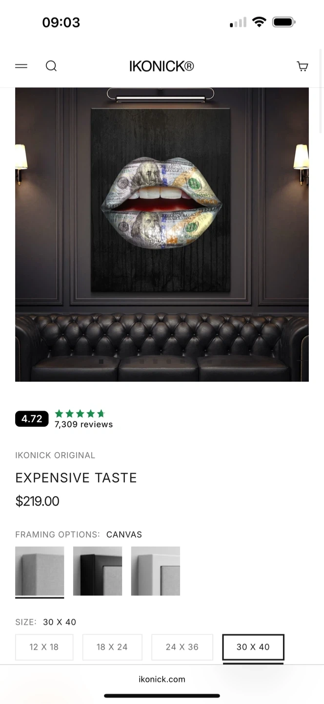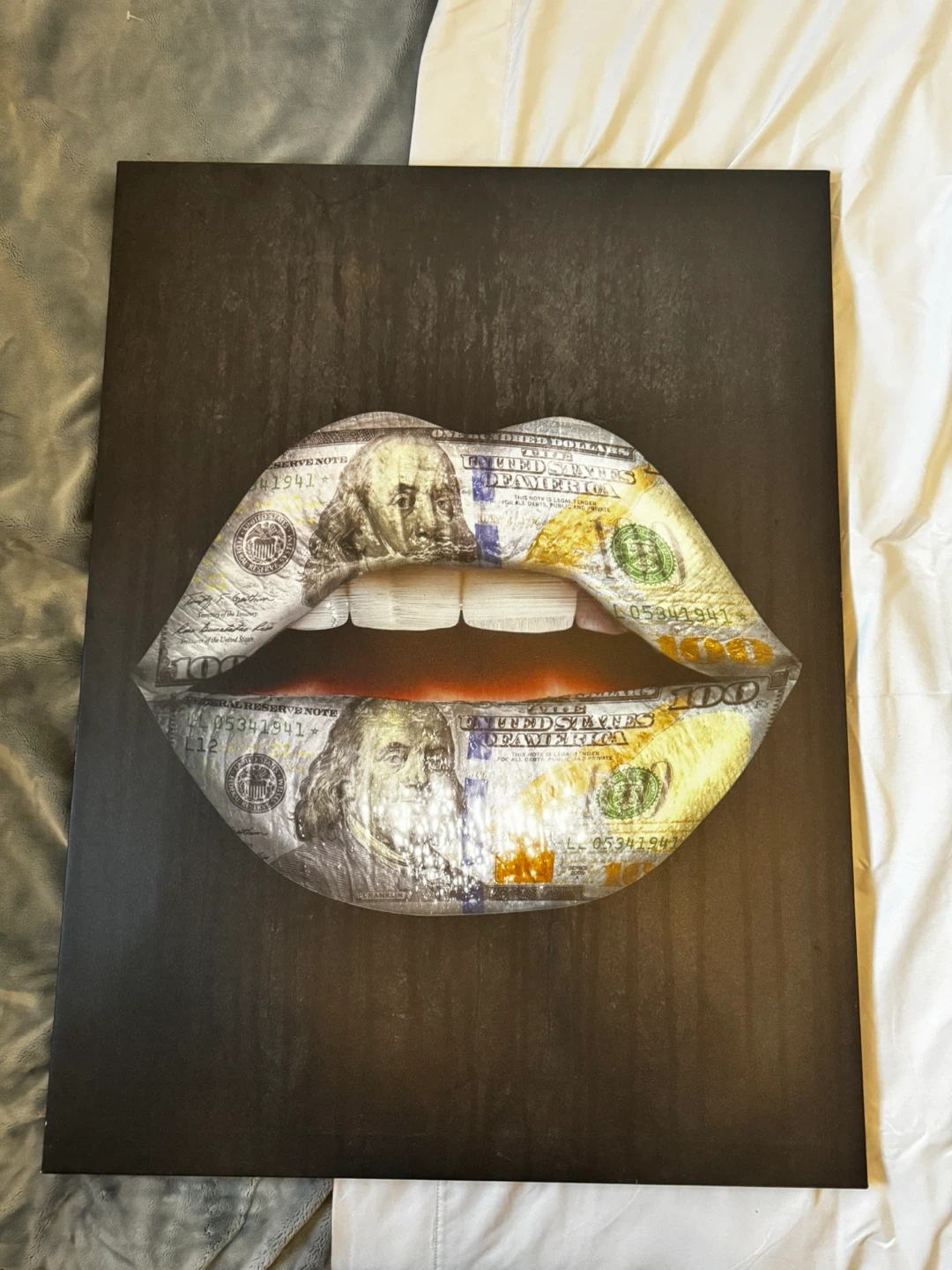 "Money Lips" canvas print. It's a unique piece featuring lips made of US hundred-dollar bills. Perfect for a statement piece in a modern or eclectic decor. Website price is what I paid in USD (about $300 CAD)